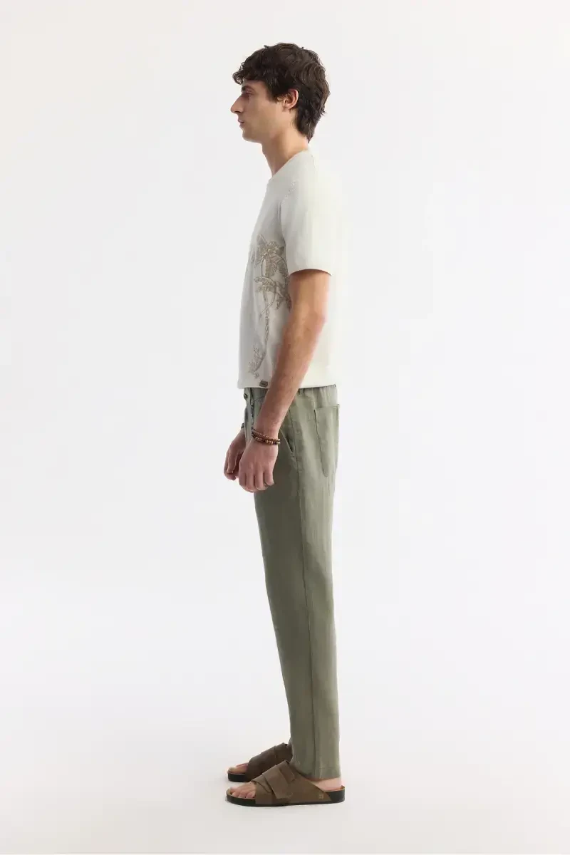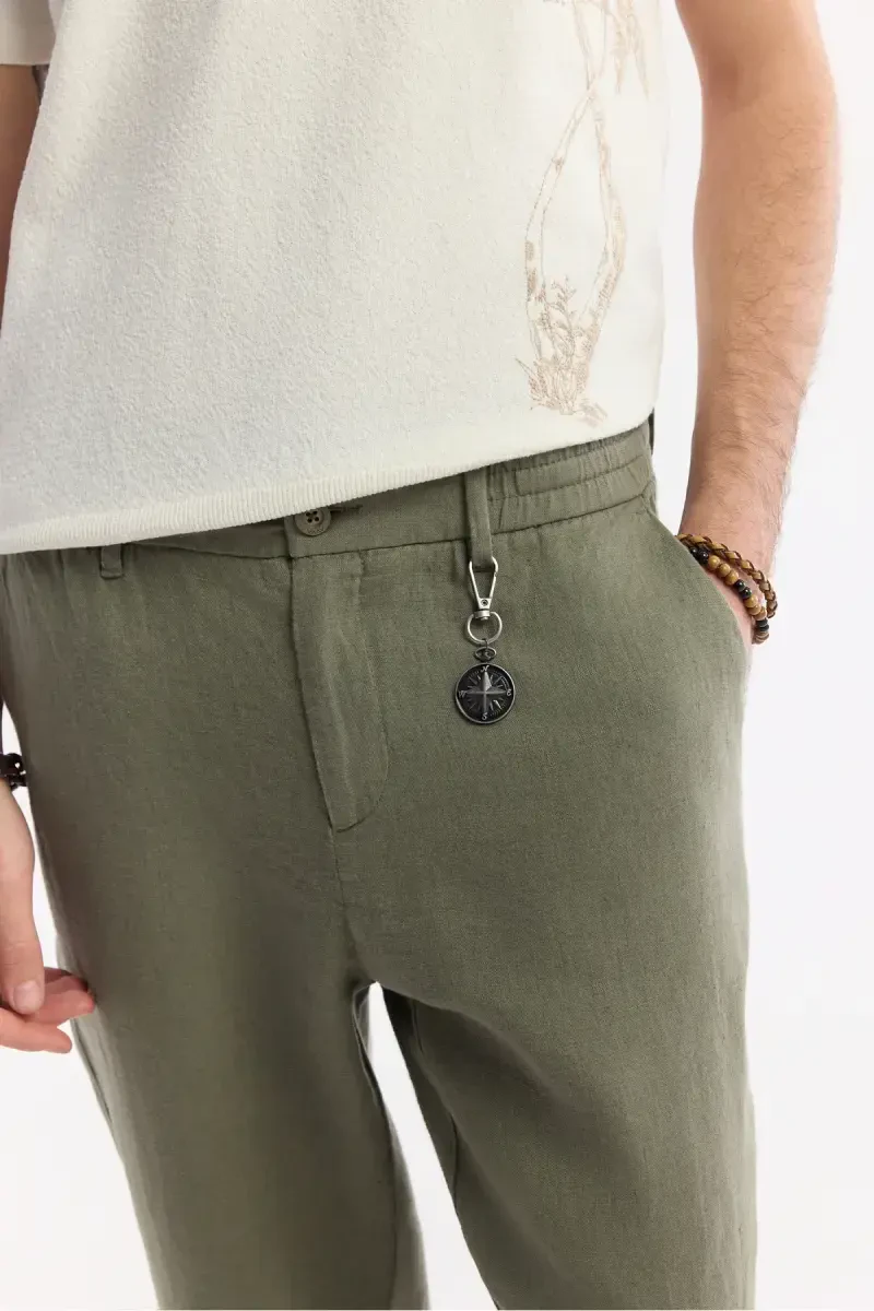 Men's Khaki Issos Relaxed Fit Trousers Elastic Waistband 100% Linen B003032