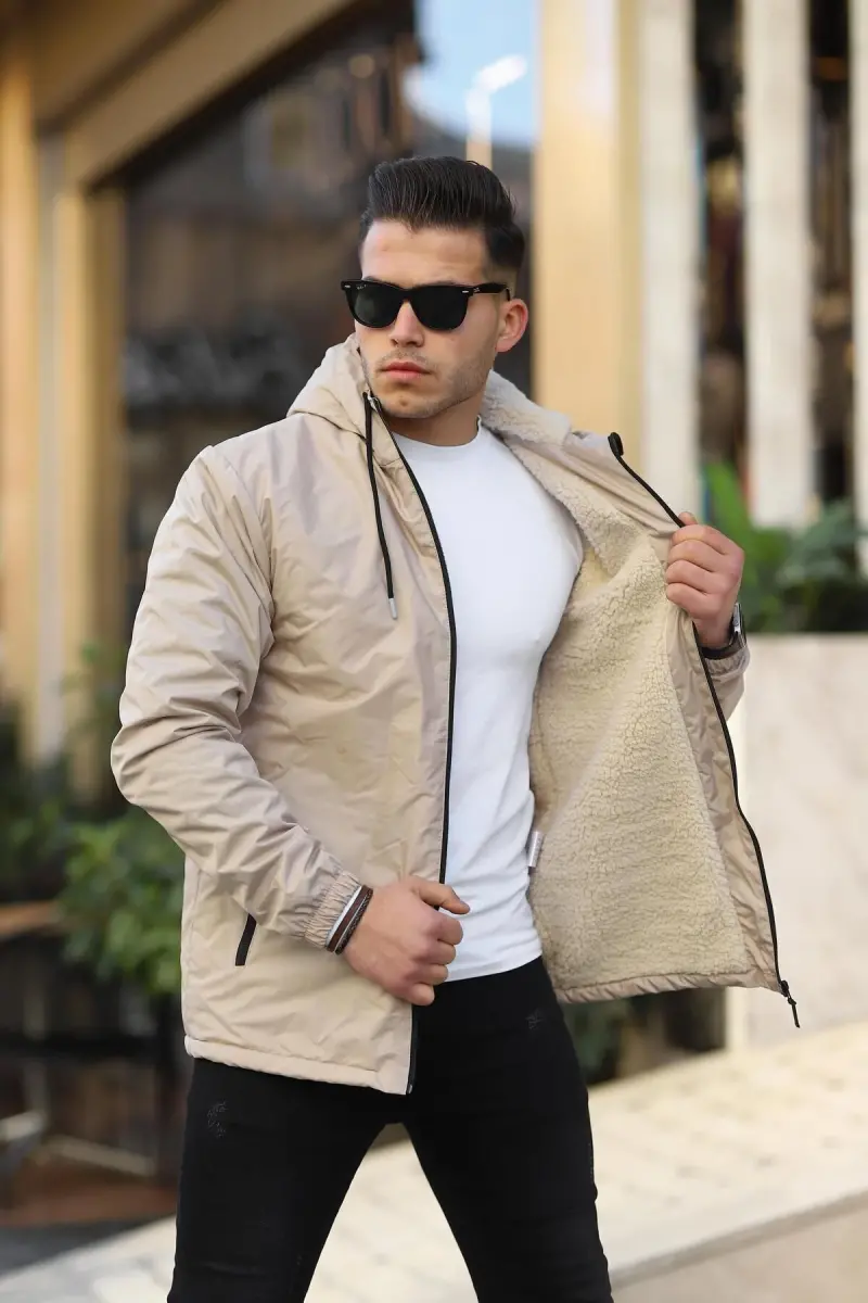 Erkek Içi Kürklü Suya Dayanıklı Kapüşonlu Cepli Yağmurluk-Taş