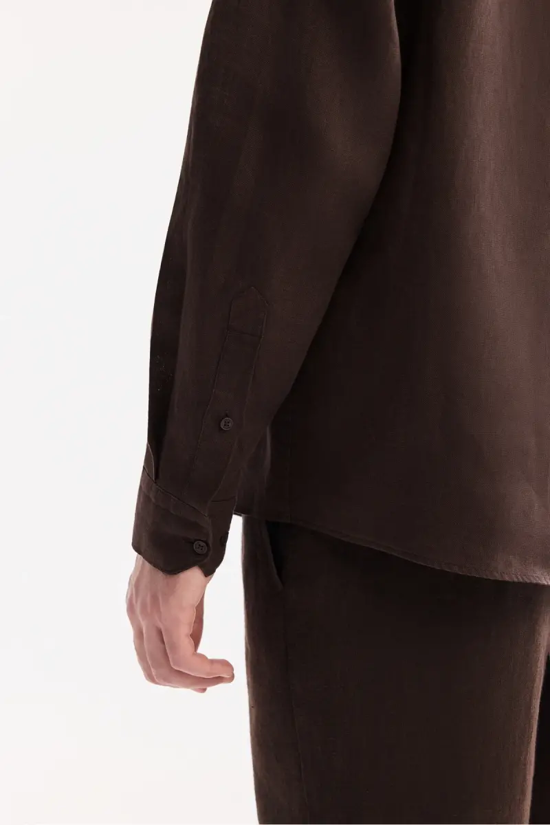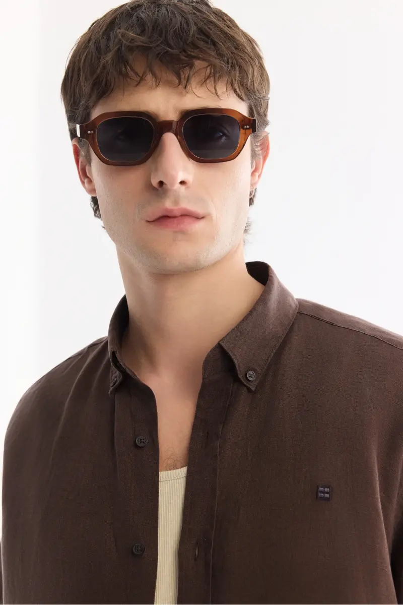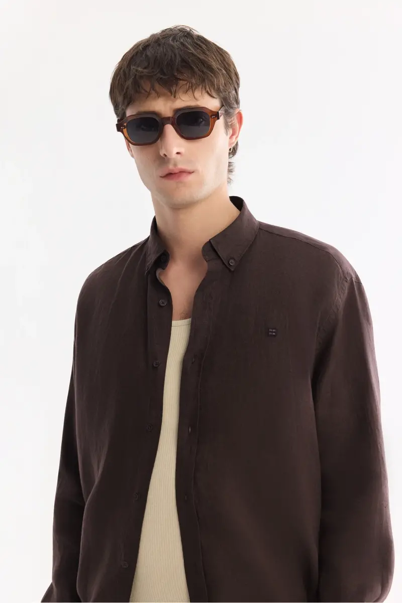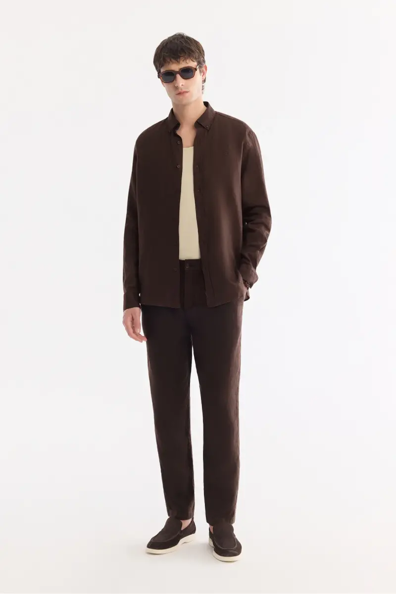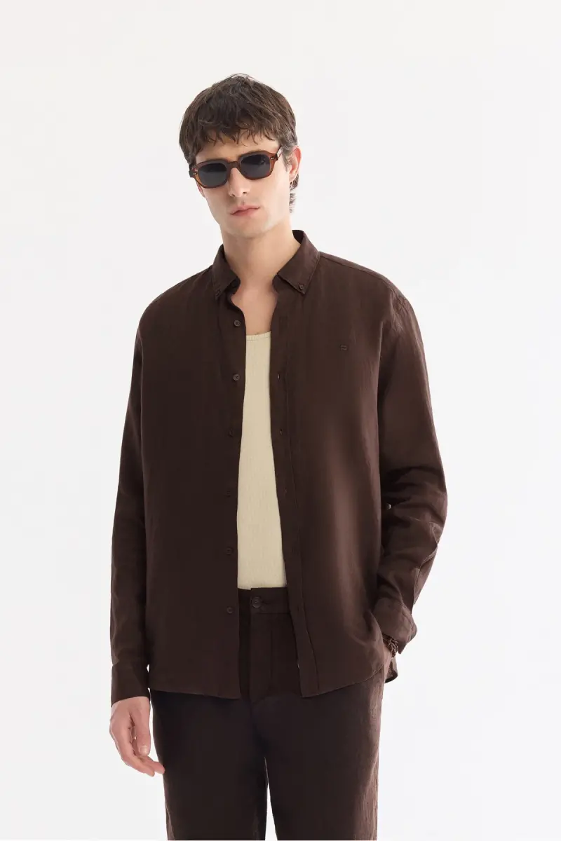 Erkek Kahve Düğmeli Yaka %100 Keten Comfort Fit Gömlek B002191-Kahve