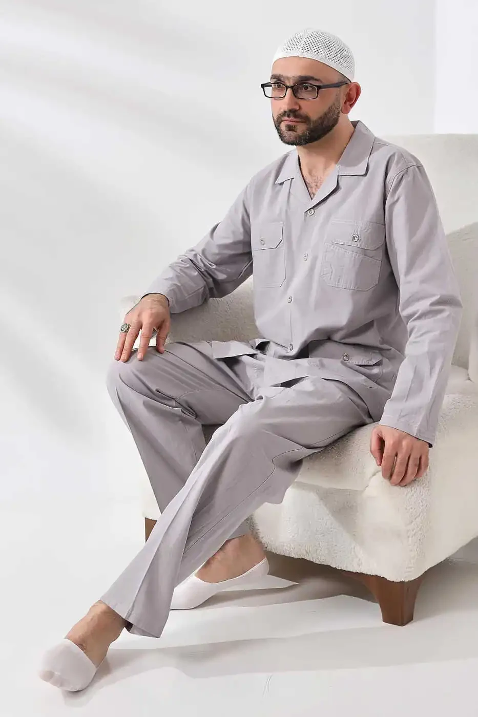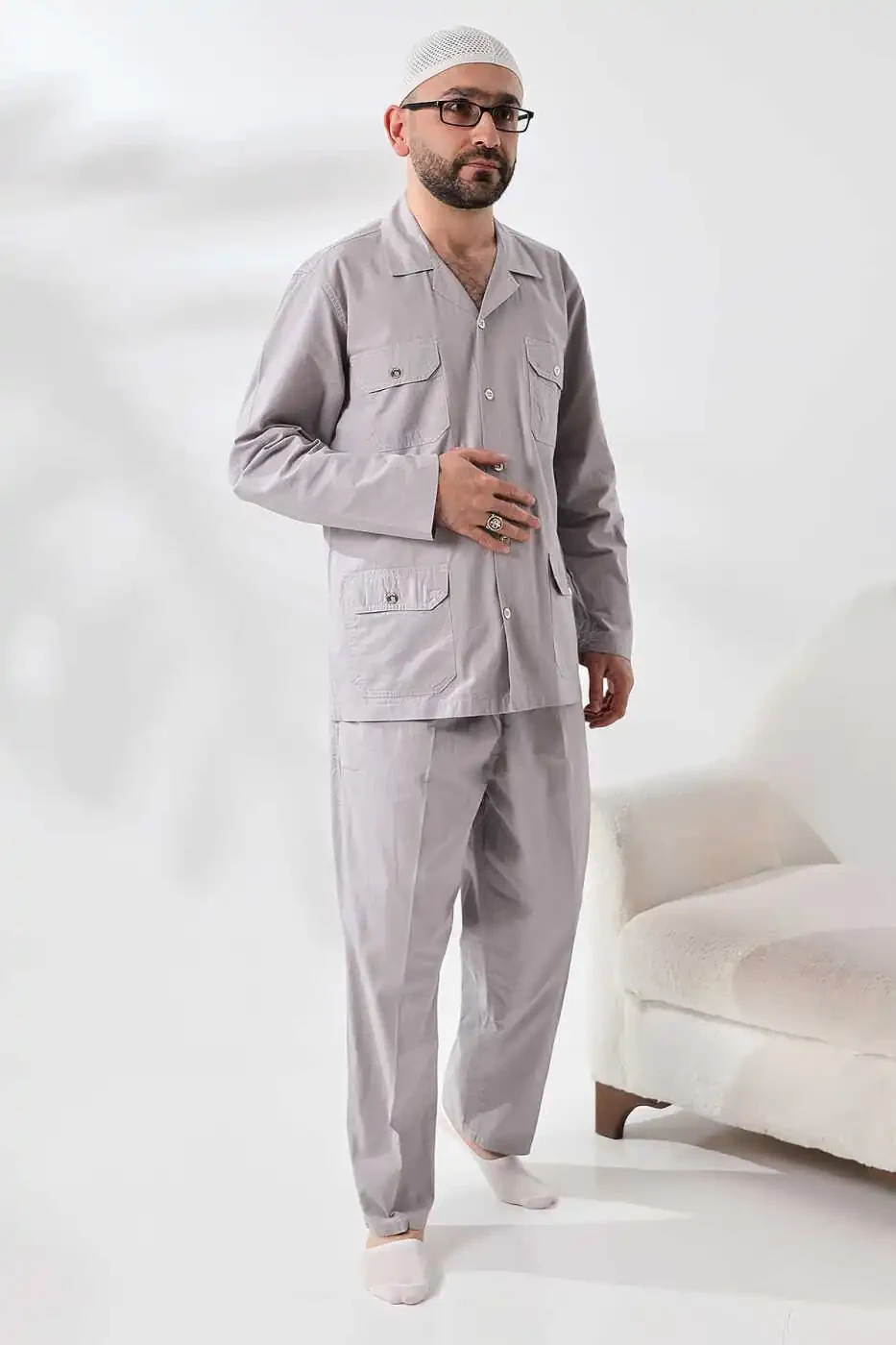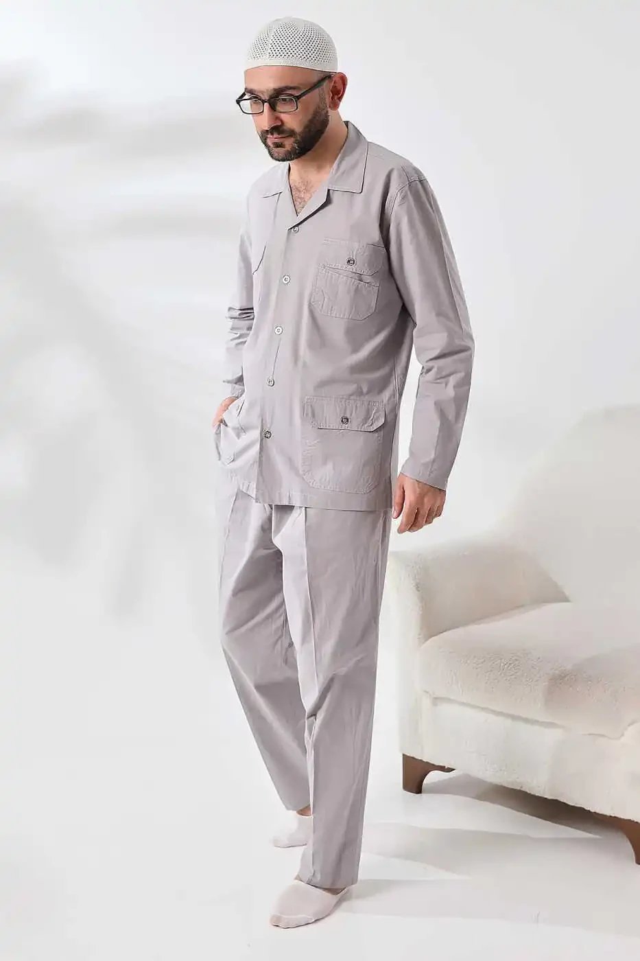 Мужской льняной 4-карманный сафари-костюм изготовлен из легкой дышащей льняной ткани, обеспечивающей прохладу и комфорт в жаркие летние дни. Этот костюм идеально подходит как для паломничества хаджа и умры, так и для повседневной носки.