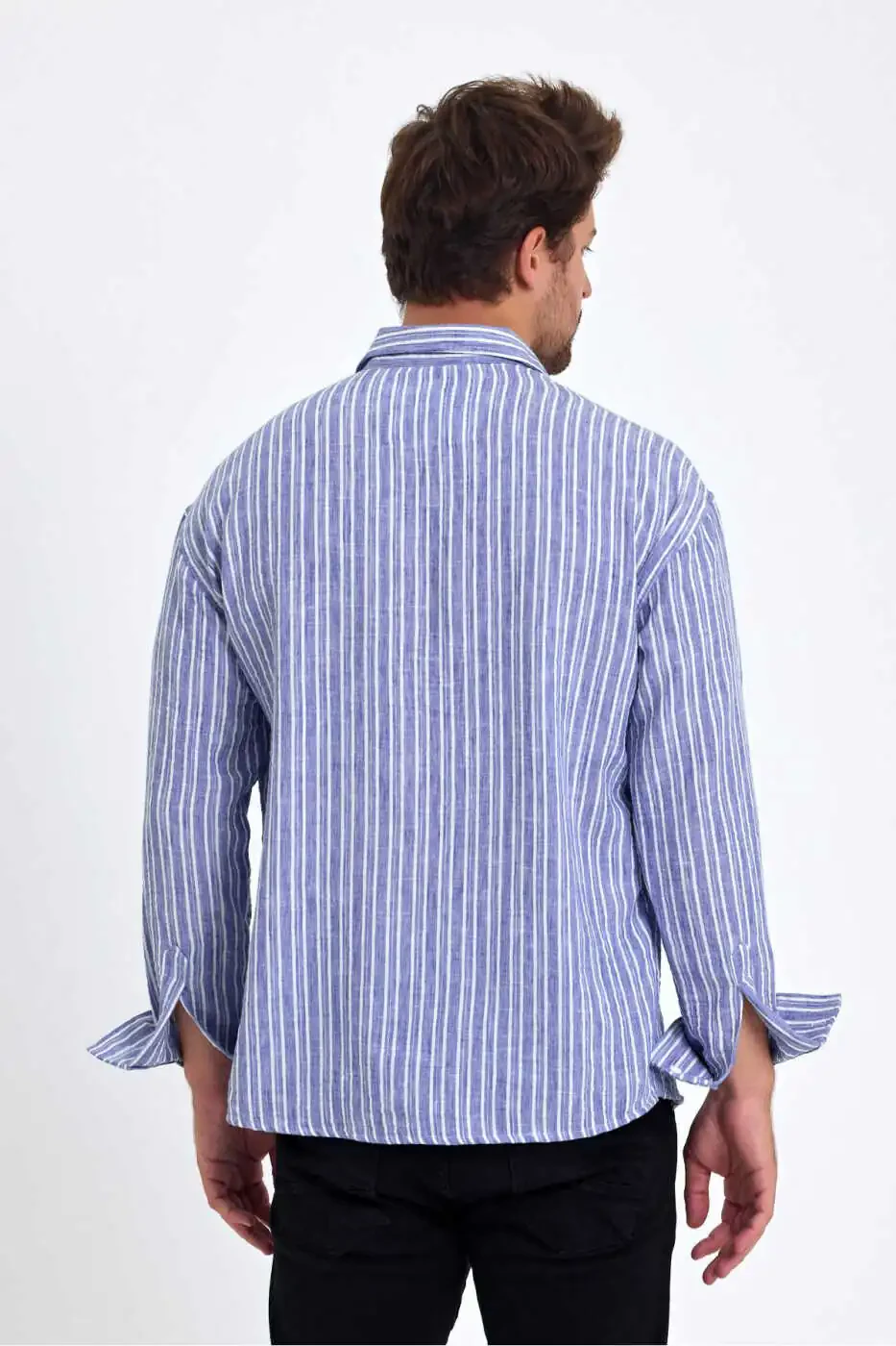 Erkaklar uchun klassik kesilgan, oddiy kesilgan uzun yengli, 100% paxta zig'ir to'qimasi, yenglarini katlab olish mumkin bo'lgan chiziqli ko'ylak