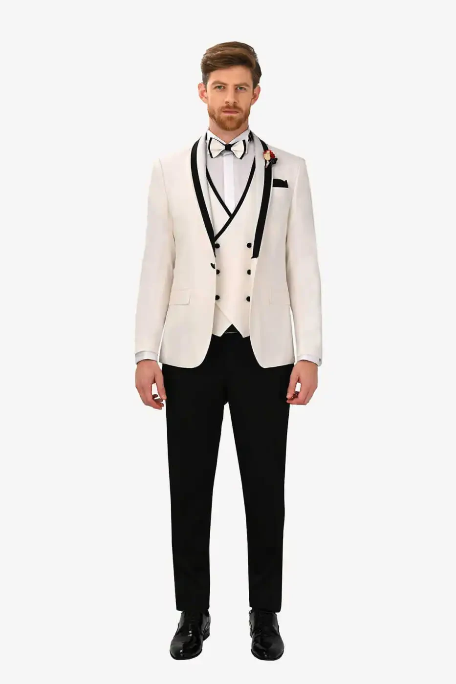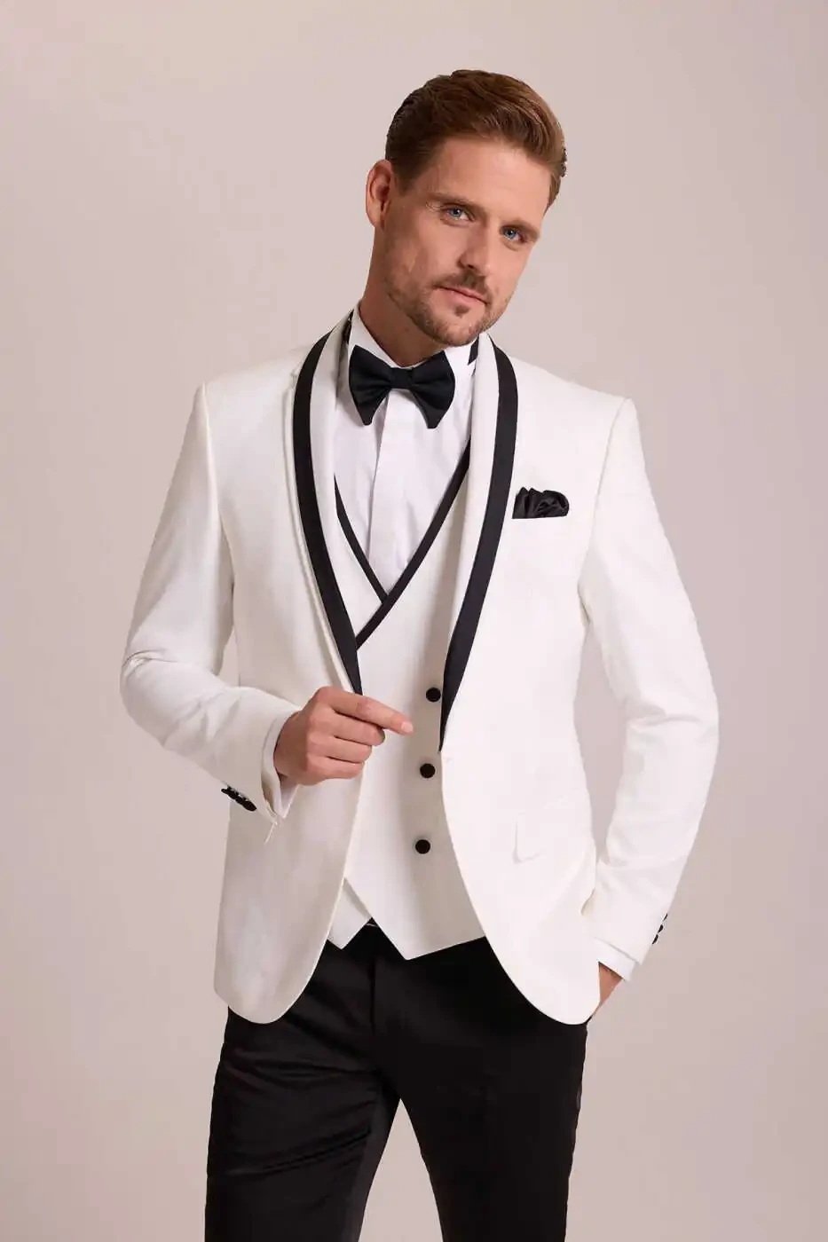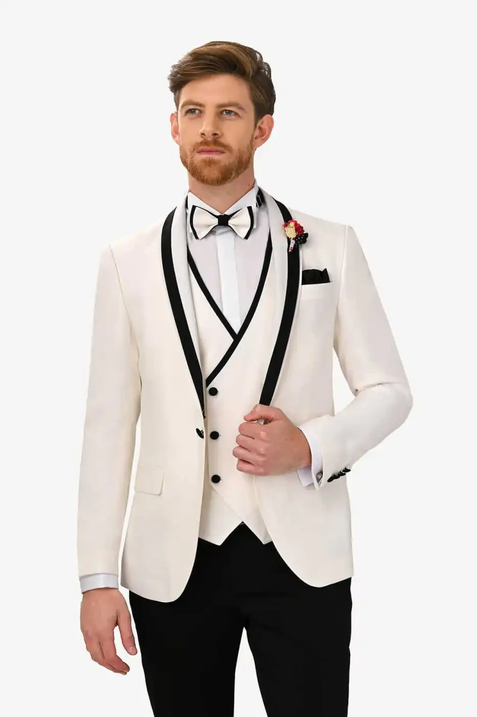 Мужской кремовый костюм для жениха с жилетом и воротником-шалью изготовлен из высококачественной ткани, дышащий и комфортный. Вы можете носить этот костюм комфортно весь день, и он будет отлично смотреться на ваших свадебных фотографиях.