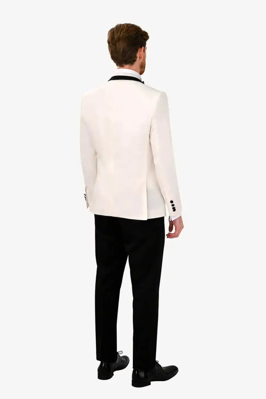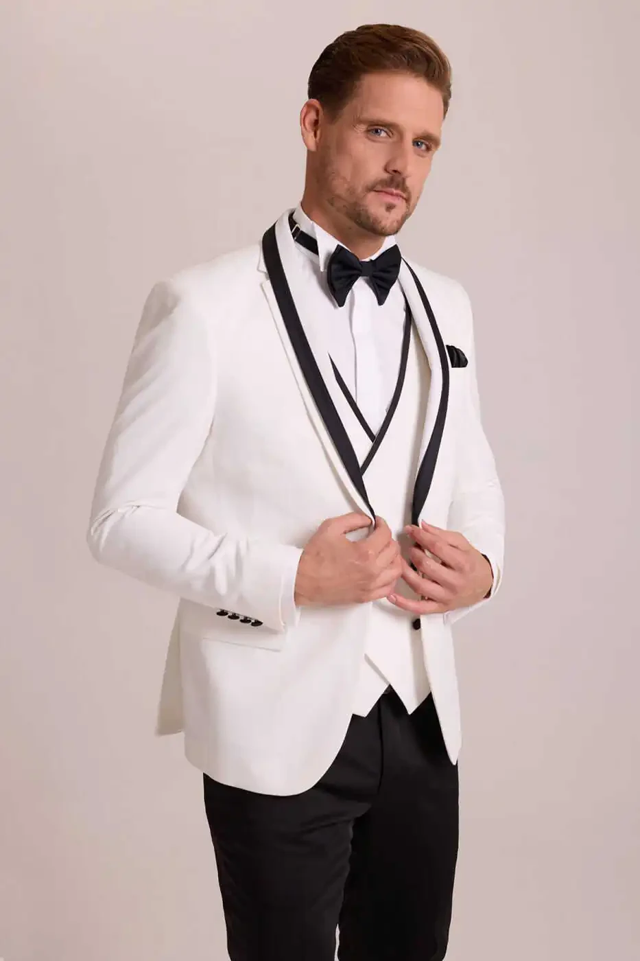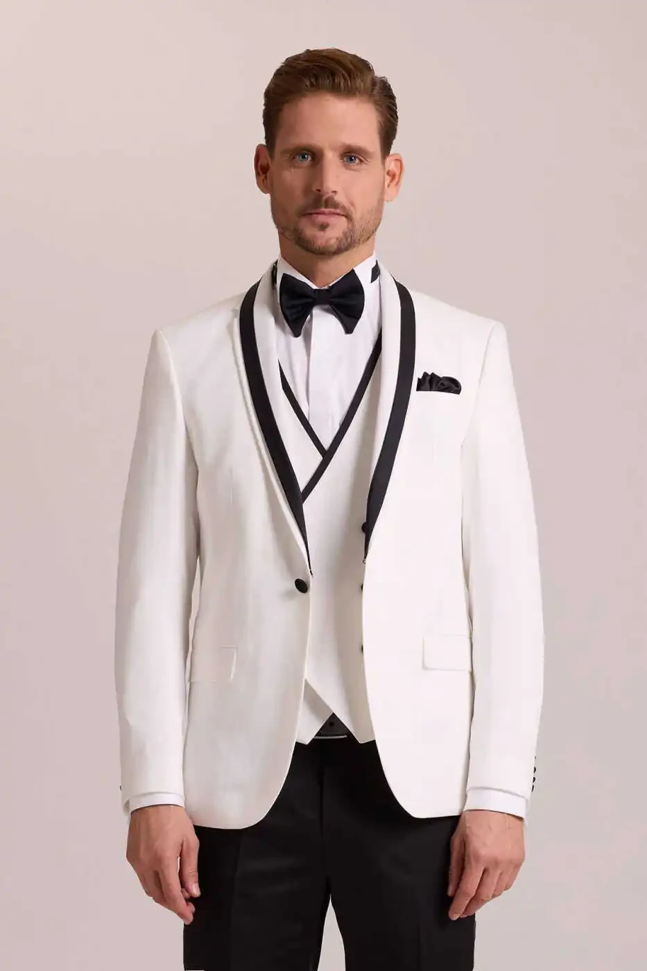Мужской кремовый костюм для жениха с жилетом и воротником-шалью изготовлен из высококачественной ткани, дышащий и комфортный. Вы можете носить этот костюм комфортно весь день, и он будет отлично смотреться на ваших свадебных фотографиях.