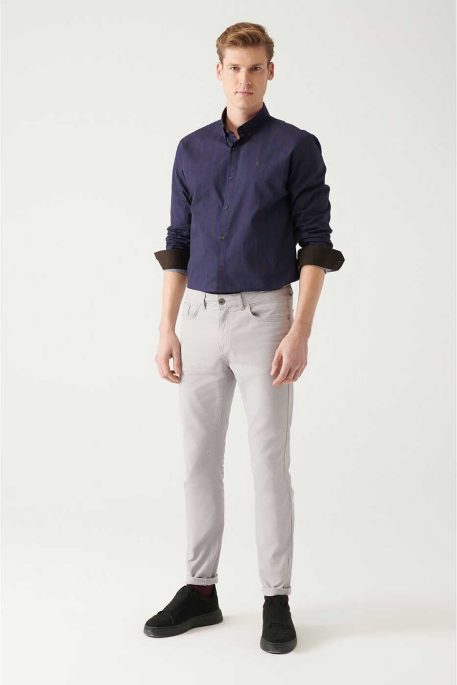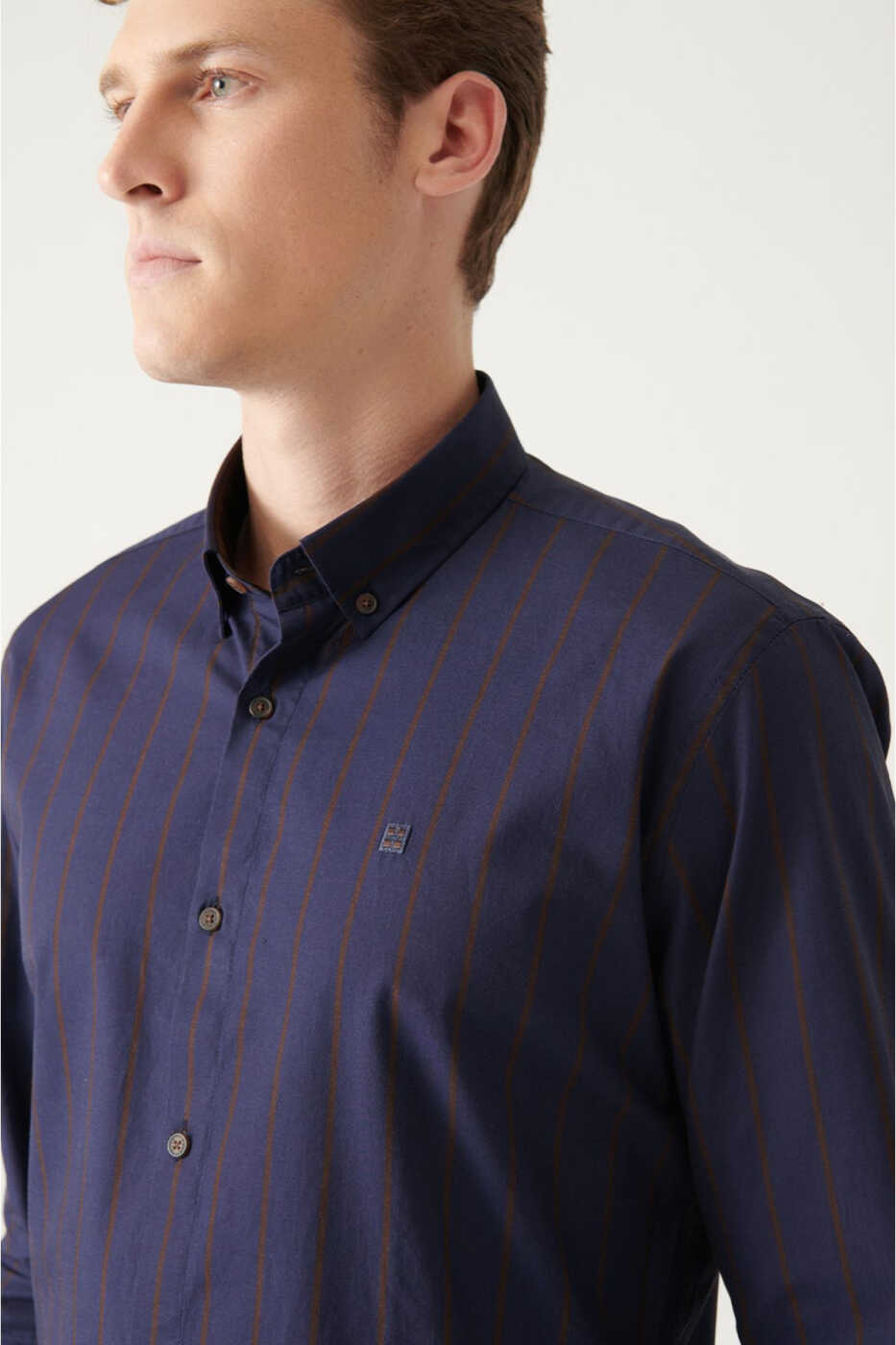 erkek gömlek, lacivert gömlek, slim fit gömlek, çizgili gömlek, poplin gömlek, pamuk gömlek, düğmeli yaka, erkek giyim