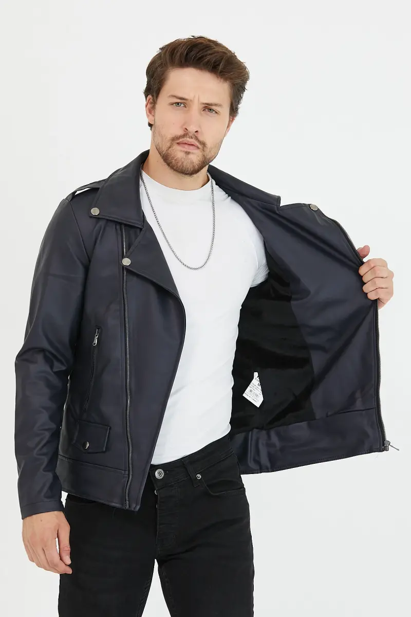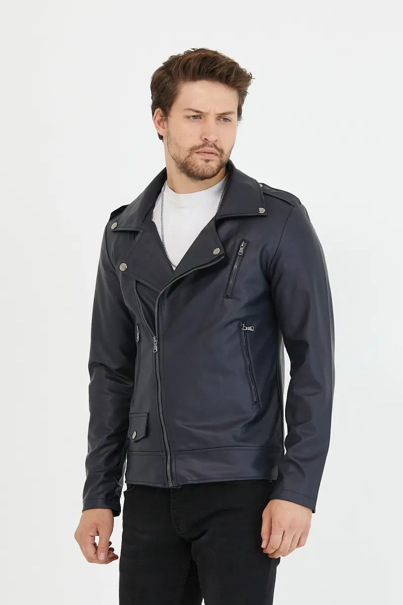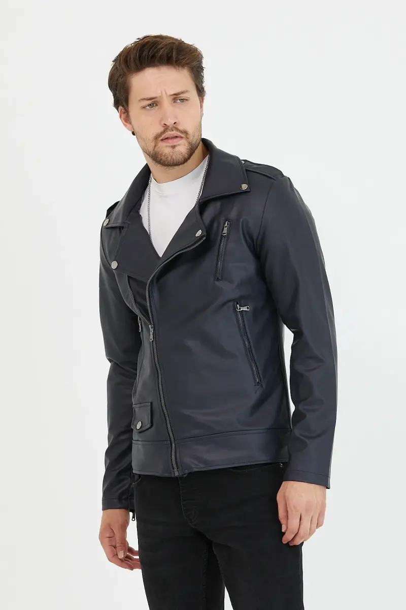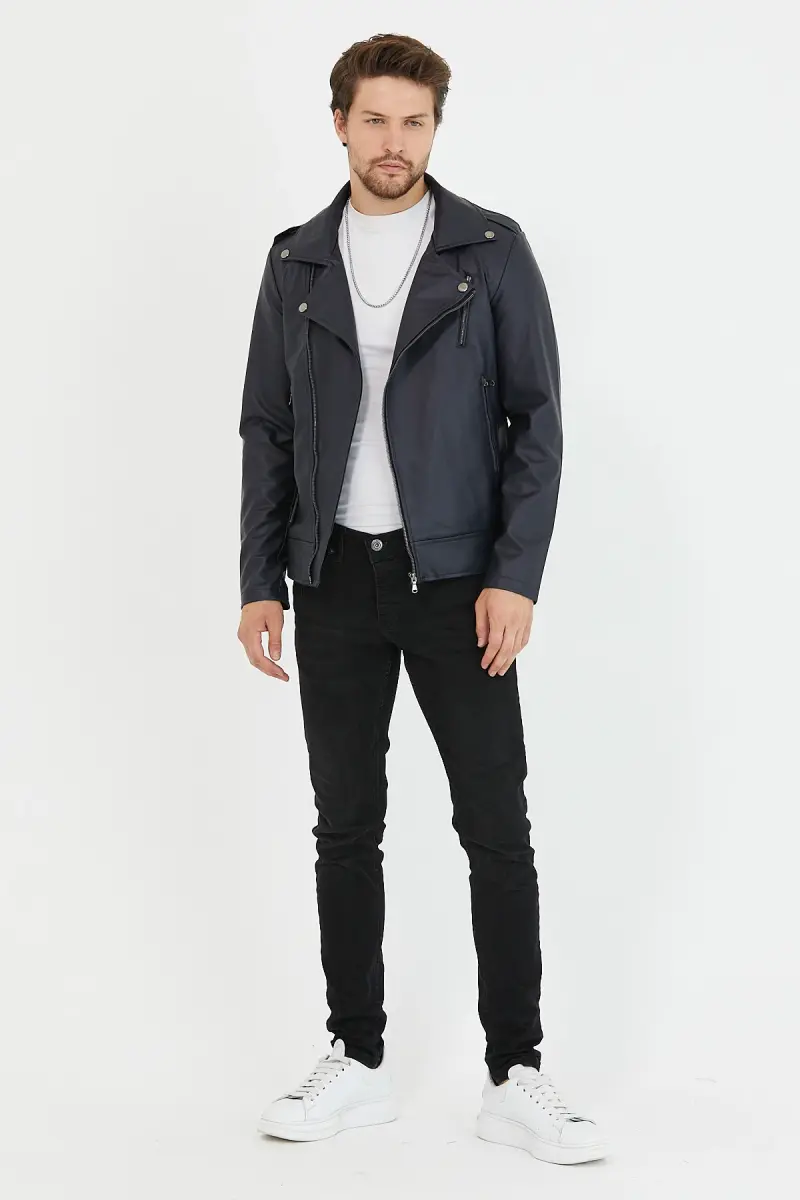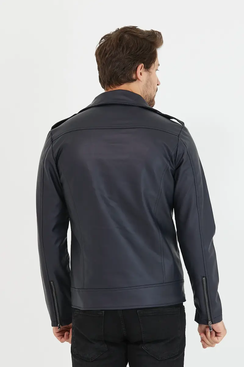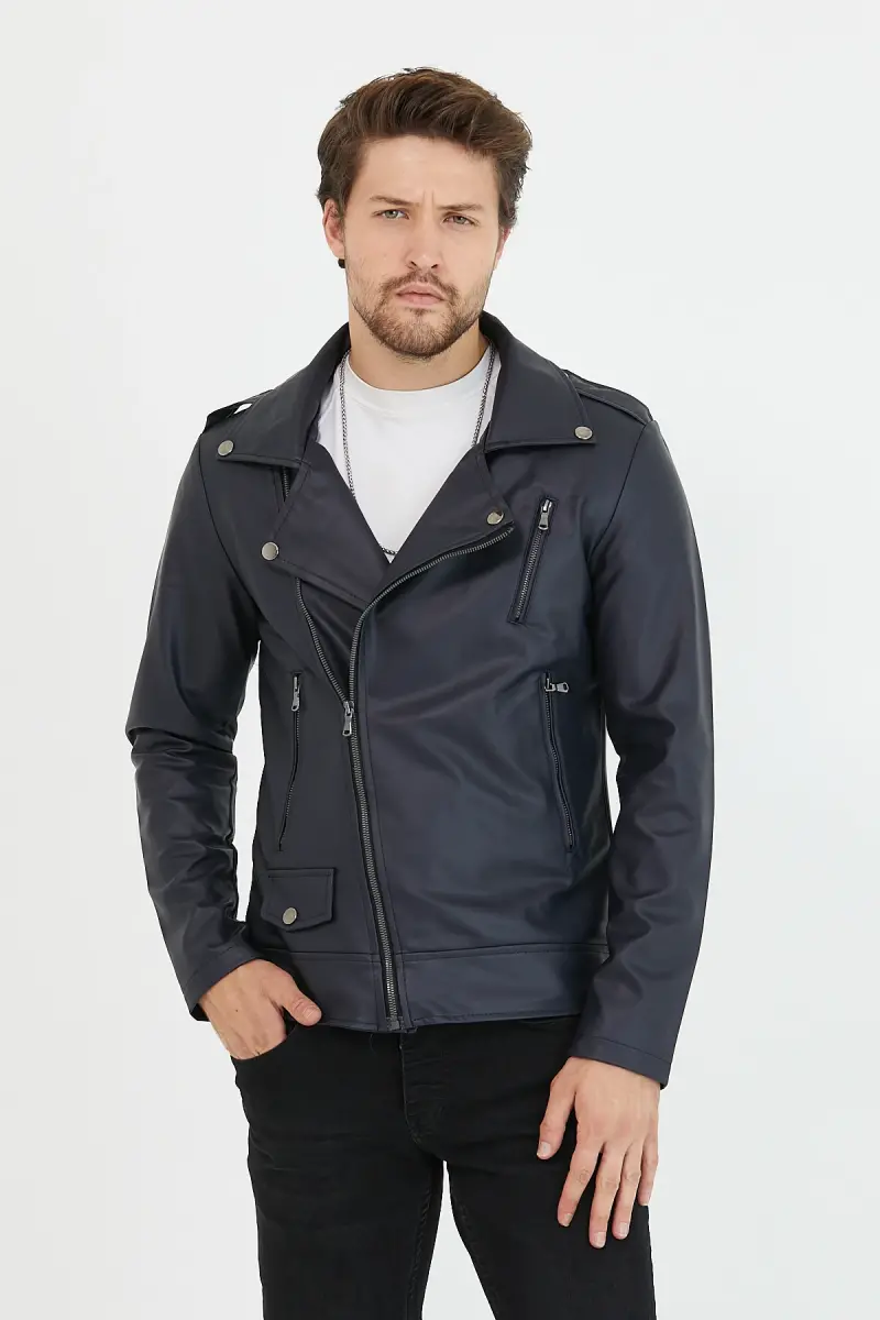 Erkek Lacivert Çapraz Fermuarlı Deri Ceket-Lacivert