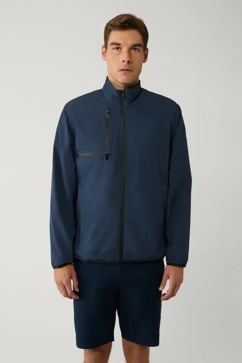 мужская куртка, темно-синяя куртка, куртка с воротником-стойкой, куртка с сетчатой подкладкой, куртка на молнии, водоотталкивающая куртка, куртка комфортного кроя