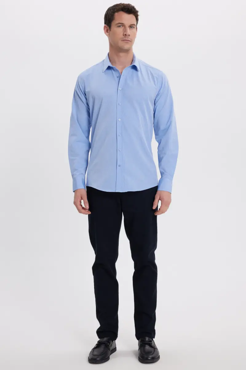 Erkek Modern Fit Dar Kesim Pamuklu Kolay Ütü Armürlü Mavi Gömlek-Mavi1