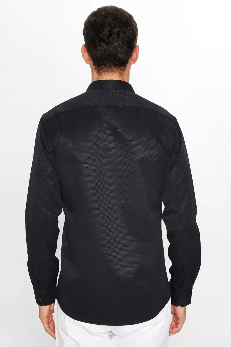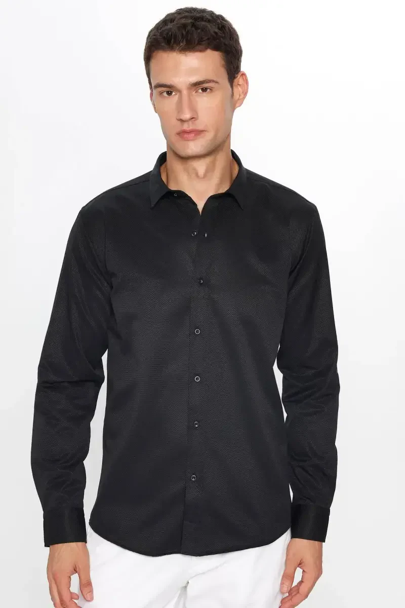Идеальный выбор для тех, кто хочет сочетать стиль и комфорт в повседневной жизни, эта современная рубашка slim fit выделяется своим элегантным кроем. Рубашка с длинным рукавом и узким кроем идеально садится по фигуре, обеспечивая стильный вид без ограничения свободы движений. Изготовленная из 100% хлопковой ткани, рубашка обеспечивает комфорт в течение всего дня благодаря своей воздухопроницаемости и мягкой текстуре. Благодаря функции легкой глажки вы можете поддерживать свой стильный образ, не беспокоясь о складках. Армированная структура делает рубашку более прочной и долговечной. Черный цвет делает эту рубашку совместимой с любыми брюками и пиджаками, позволяя вам создавать стильный образ в любой обстановке, от деловых встреч до повседневной жизни.