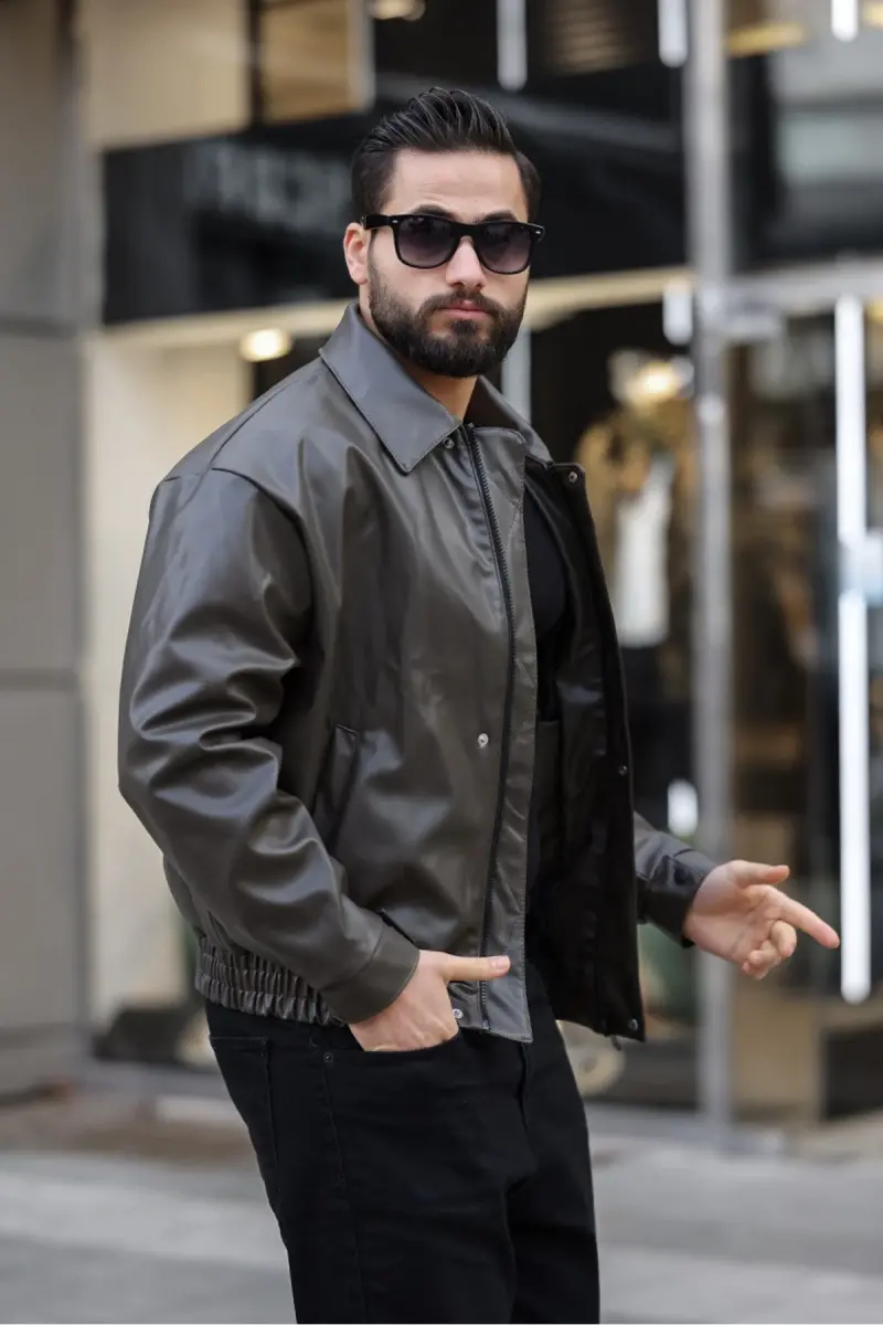 ERKEK OVERSİZE/SALAŞ PREMİUM BOMBER DERİ CEKET-Haki DERİ