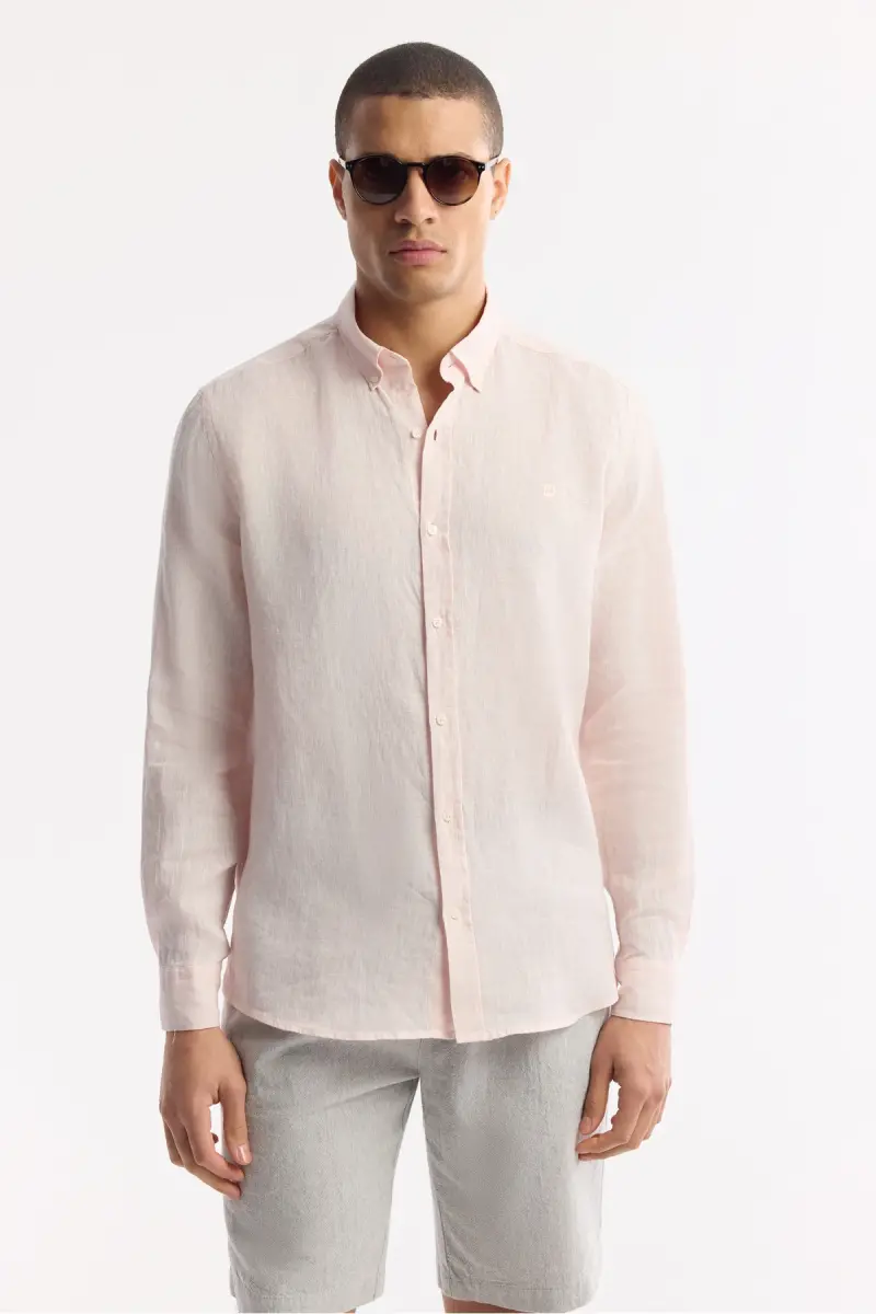 Мужская Розовая Льняная Рубашка - идеальный выбор для того, чтобы оставаться прохладным и стильным в летнюю жару. Изготовленная из 100% льняной ткани, ее натуральная структура обеспечивает воздухопроницаемость и комфорт в носке. Ее рубашечный воротник на пуговицах и комфортный крой придают ей современный и стильный вид.