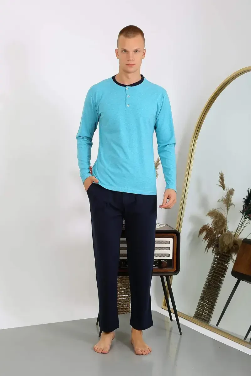 Erkek Penye Uzun Kol Pijama Takımı 6860 Turkuaz | %100 Pamuk | 24 Saat Kargo