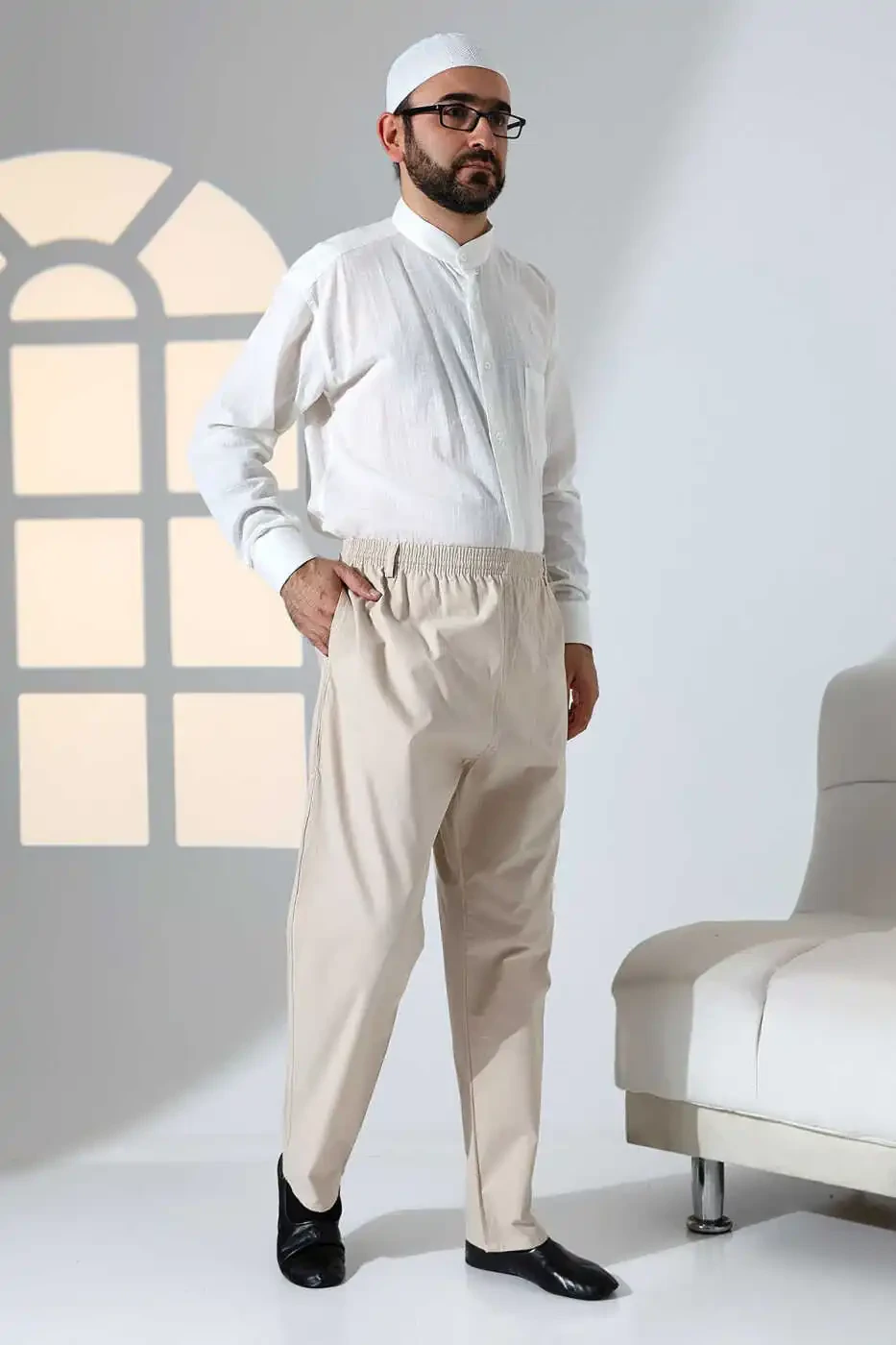 Erkaklar uchun Keng Kuy, Bel Lastikli, Kipli Hajj va Umra Keten Shalvor Shimlar - Bej (KRK) o'zining maxsus dizayni va sifatli matolari tufayli haj va umra davrlarida qulaylik va zamonaviy ko'rinish imkoniyatini taqdim etadi. Keng kesimi tufayli harakat erkinligini ta'minlovchi bu zamonaviy shalvor shim, elastik beli tufayli har qanday tanaga osonlik bilan mos tushadi. Shalvorning yon tomonlaridagi tugma tafsilotlari estetik ko'rinish beradi, va ikkita fermali kiplari narsalaringizni ishonchli tarzda tashishingizga imkon beradi.