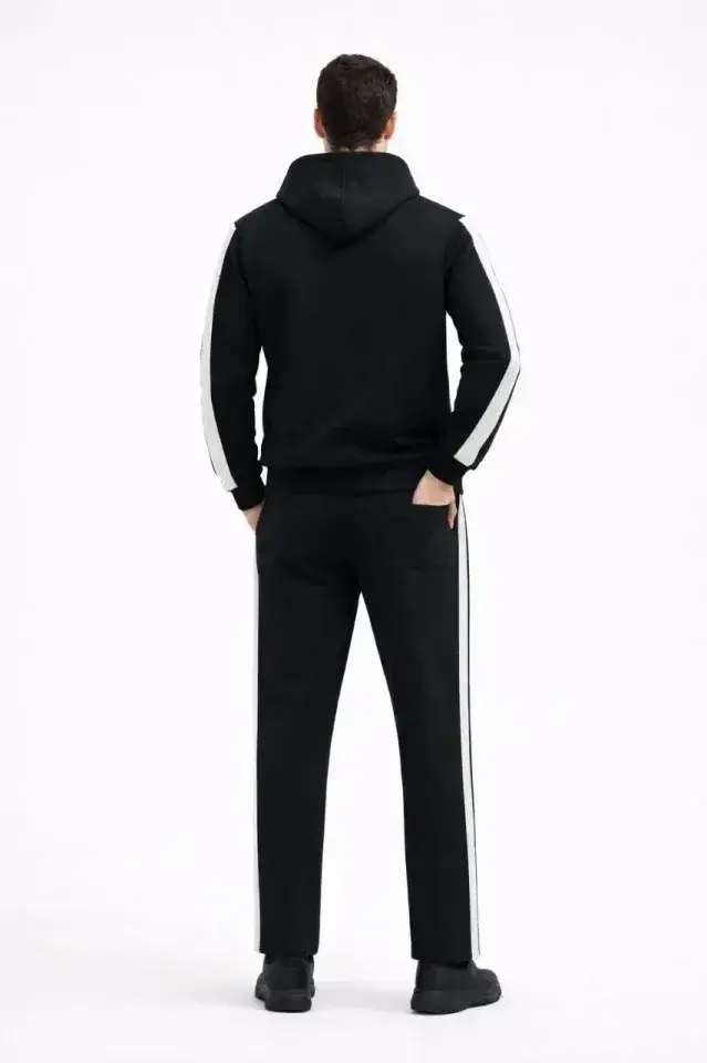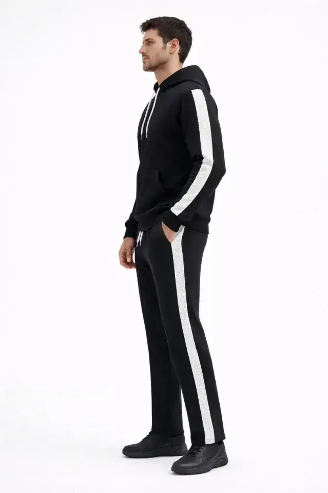 Erkek Şeritli Eşofman Takım Kapüşonlu Sweatshirt Boru Paça Alt, Oversize 3 Iplik Pamuklu - Siyah