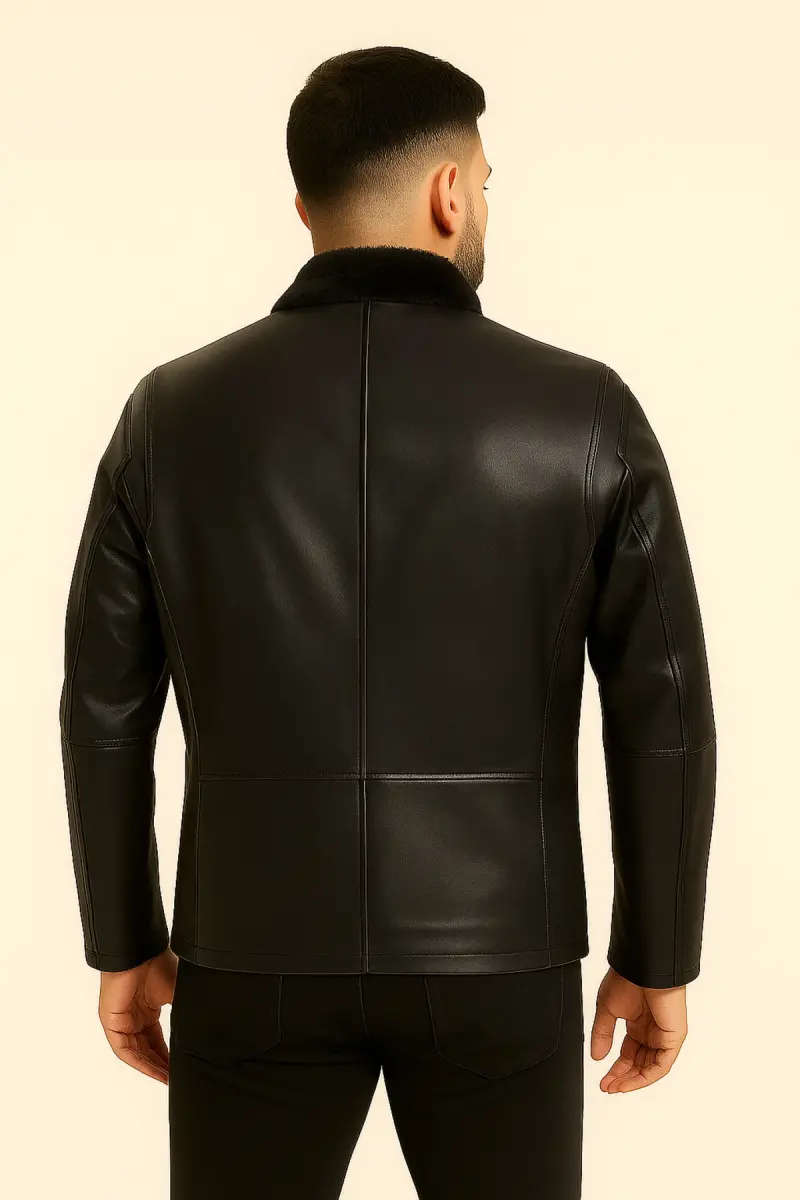 Erkek Seyyar Yaka Kürklü Hakiki Deri Ceket-Siyah