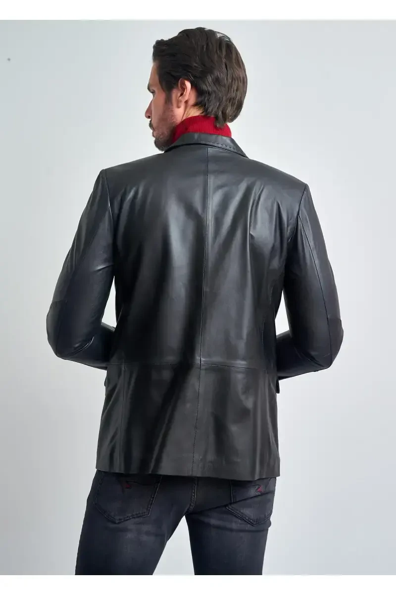 Куртка имеет классический воротник, застежку на пуговицах и два боковых кармана. Эти практичные особенности обеспечивают как стильный вид, так и возможность надежно носить свои вещи. Черный цвет - это вневременной выбор, который дополняет любой наряд. Независимо от того, предпочитаете ли вы повседневный образ с джинсами и футболкой или создаете стильную комбинацию с костюмом, эта кожаная куртка всегда будет идеальным дополнением.