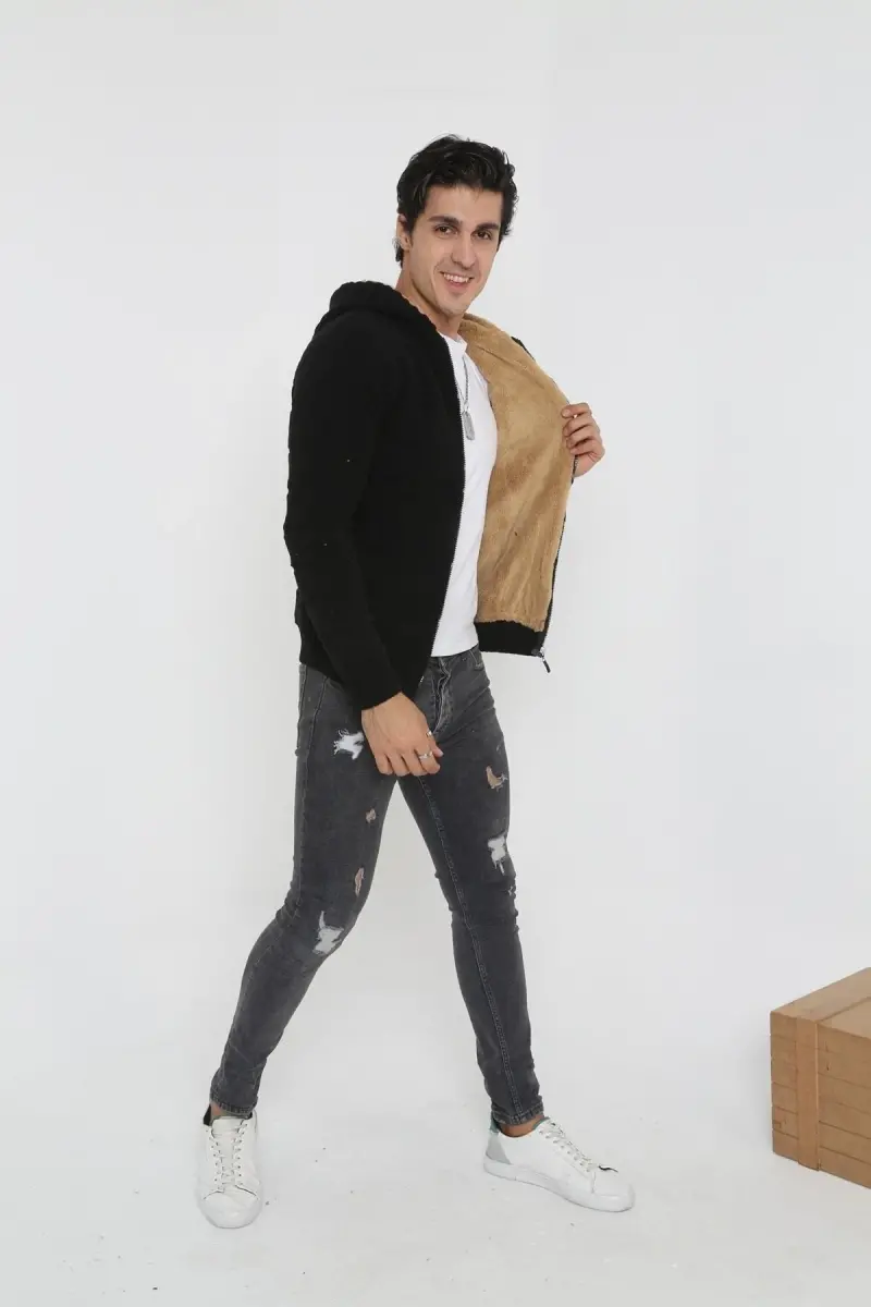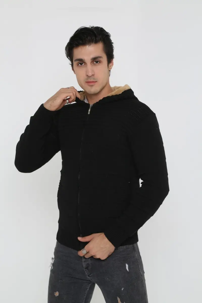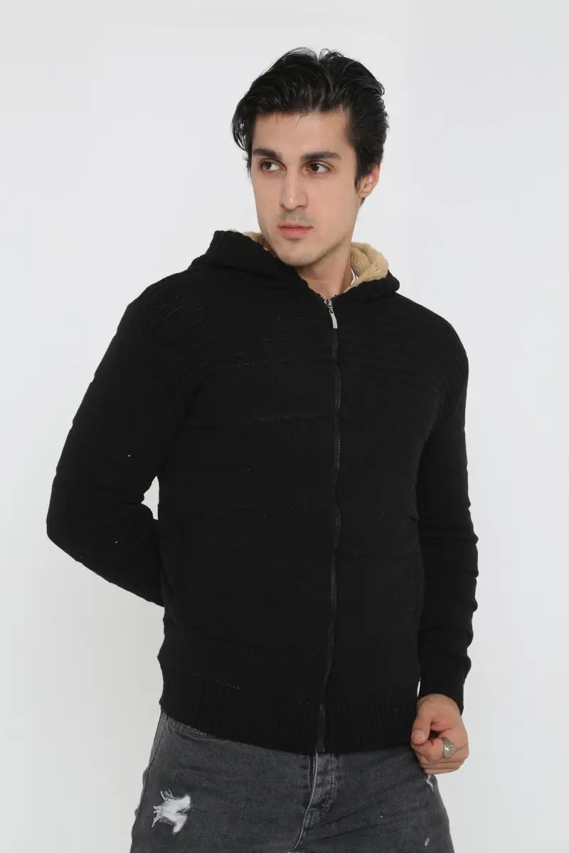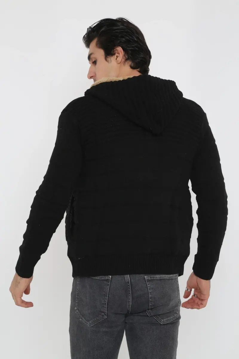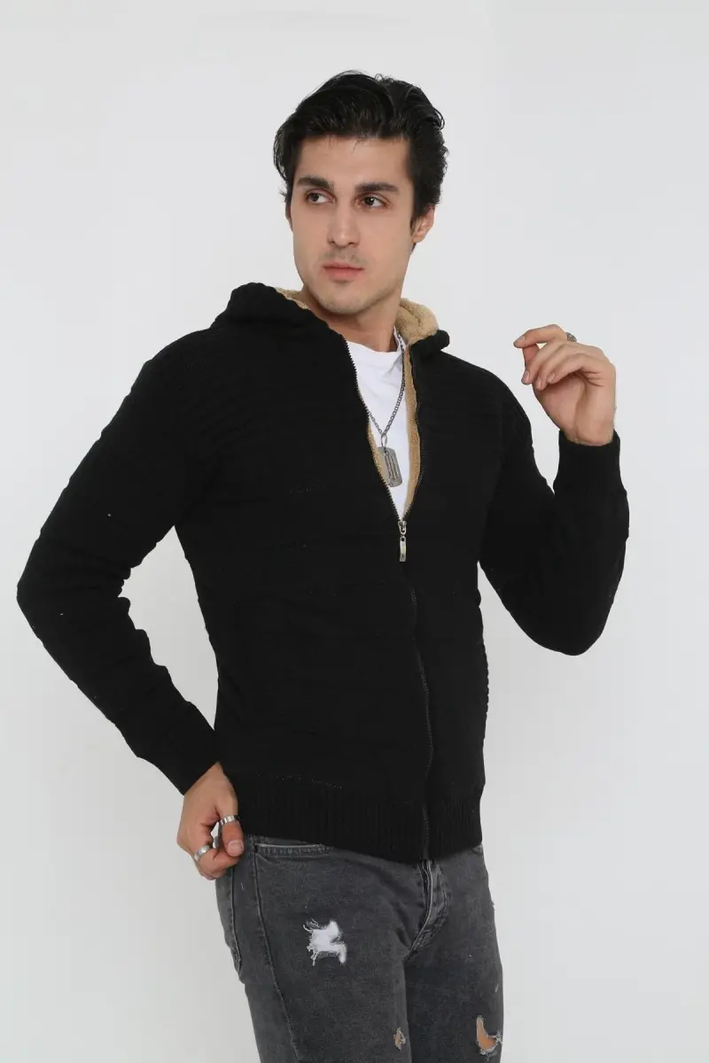 Erkek Siyah Içi Kürklü Kapsonlu Triko Örme Hırka-siyah