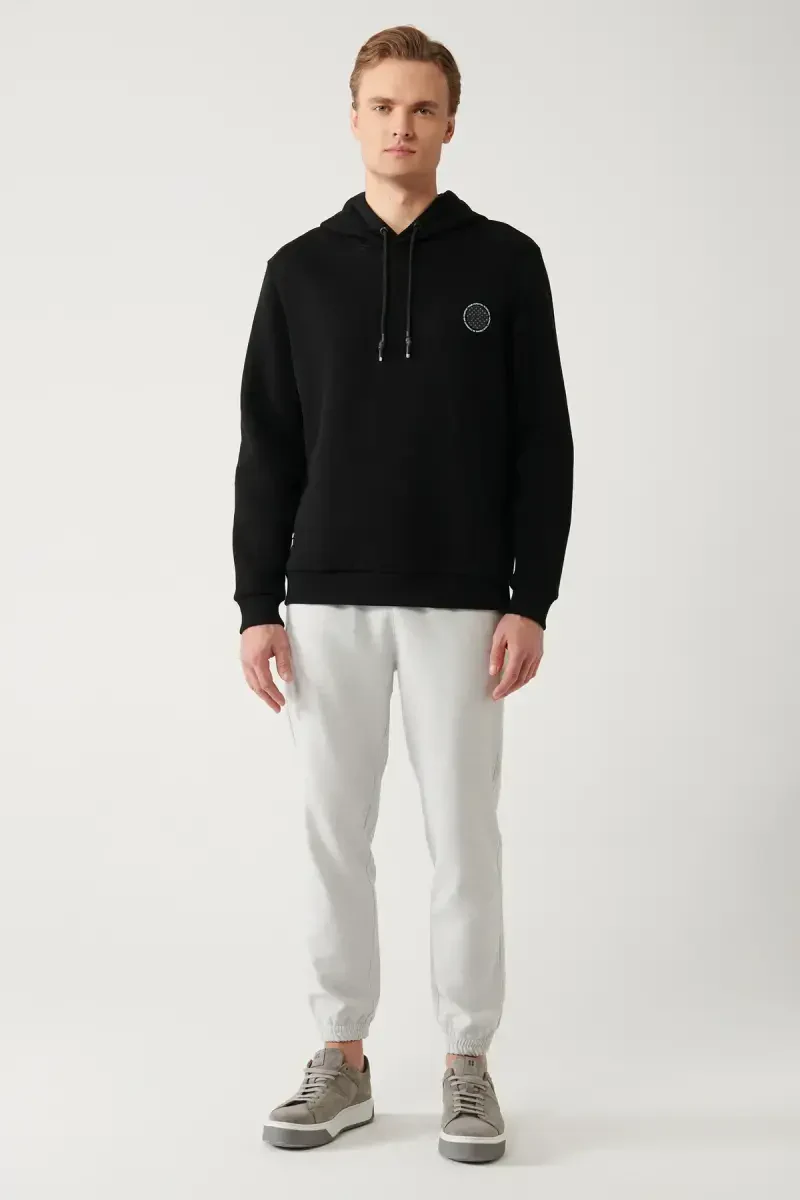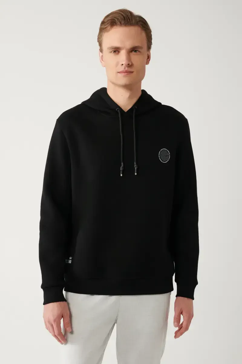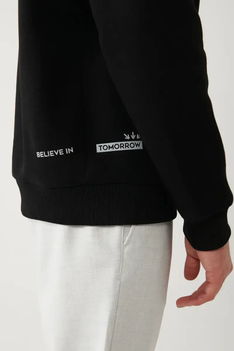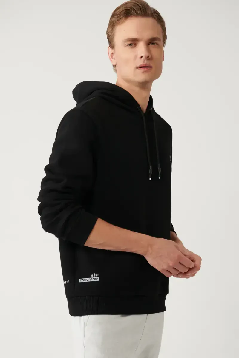 This men's black sweatshirt combines style and comfort, adding a modern touch to your everyday style. Featuring a hooded neck, 3-thread brushed fabric and eye-catching print details on the chest, this sweatshirt is the perfect choice to accompany you every moment. With its regular fit, this sweatshirt fits perfectly to your body, helping you reflect your confidence and style.