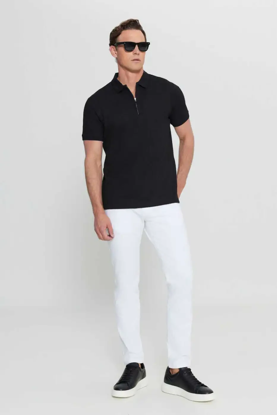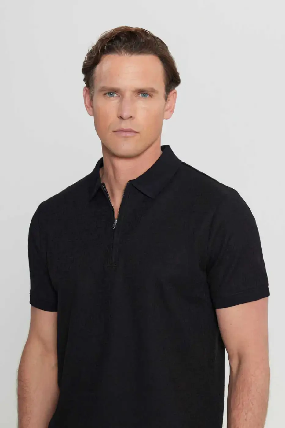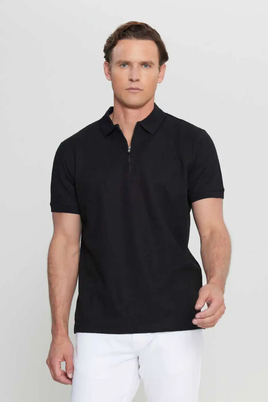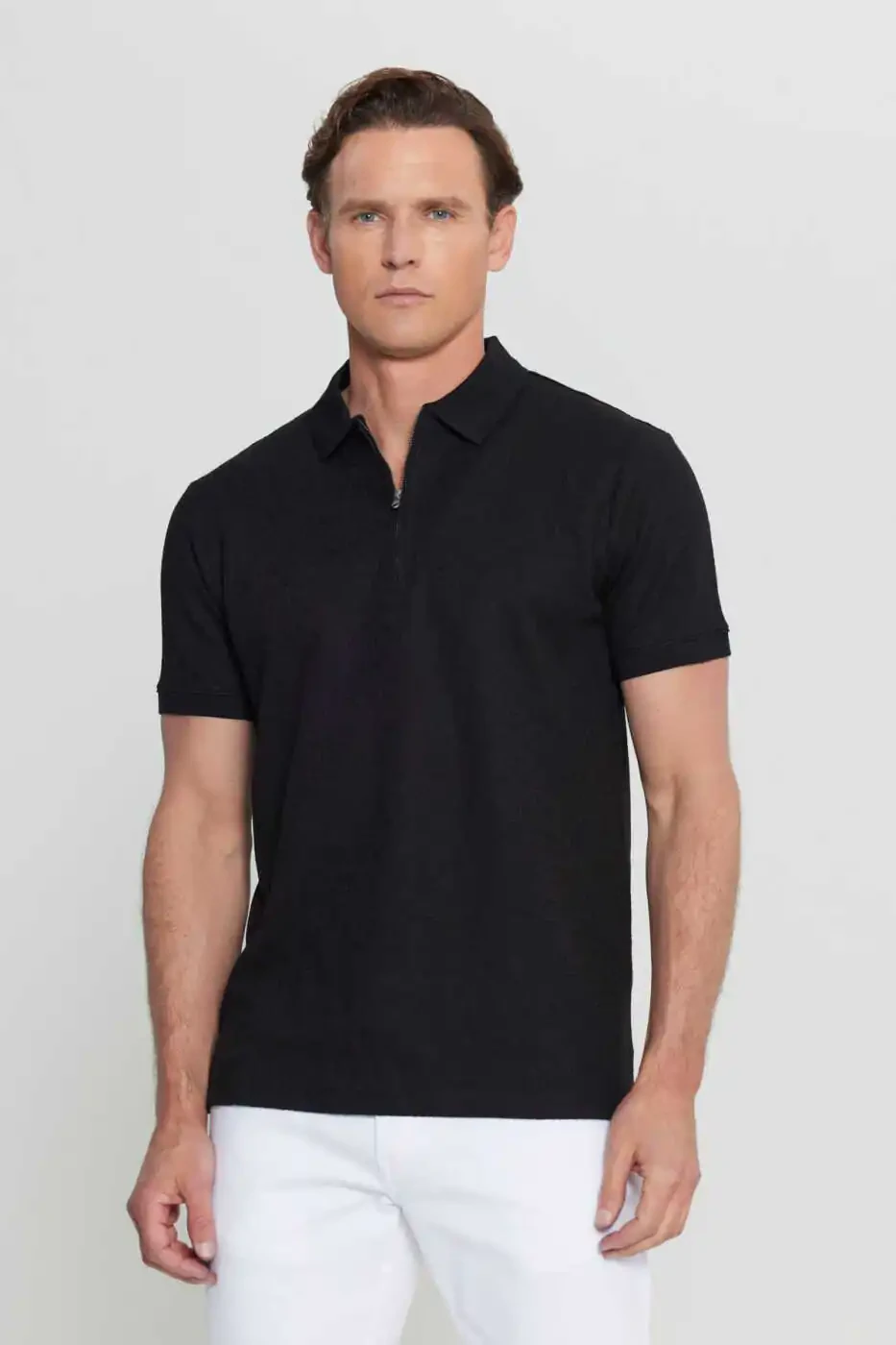 The Altınyıldız Classics Men's Black Cotton Slim Fit Narrow Cut Zippered Collar Jacquard Stretch T-Shirt, a perfect blend of elegance and comfort, is a must-have in the modern man's wardrobe. Made with a blend of 85% cotton, 10% polyester and 5% elastane, this t-shirt offers all-day comfort with its breathable structure. Its slim fit cut perfectly embraces your body, while its narrow cut gives a modern and stylish look. The zippered collar detail adds a sporty air and differentiates the t-shirt. The jacquard pattern adds a sophisticated touch to the t-shirt, while the black color offers timeless elegance.Belonging to the summer collection, this t-shirt can be easily used in hot weather with its short sleeves and pocketless design. You can choose it as a stylish combination piece both in daily life and on special occasions. It goes perfectly with jeans, chinos or shorts. You can personalize your style by completing it with sneakers or loafers.Standing out with Altınyıldız Classics quality and elegance, this t-shirt will be an indispensable part of your wardrobe for a long time with its durable structure. It is recommended to choose the size by considering the product size chart and model measurements. You can extend the life of the product by following the washing instructions. Don't miss this opportunity offered with limited stocks!