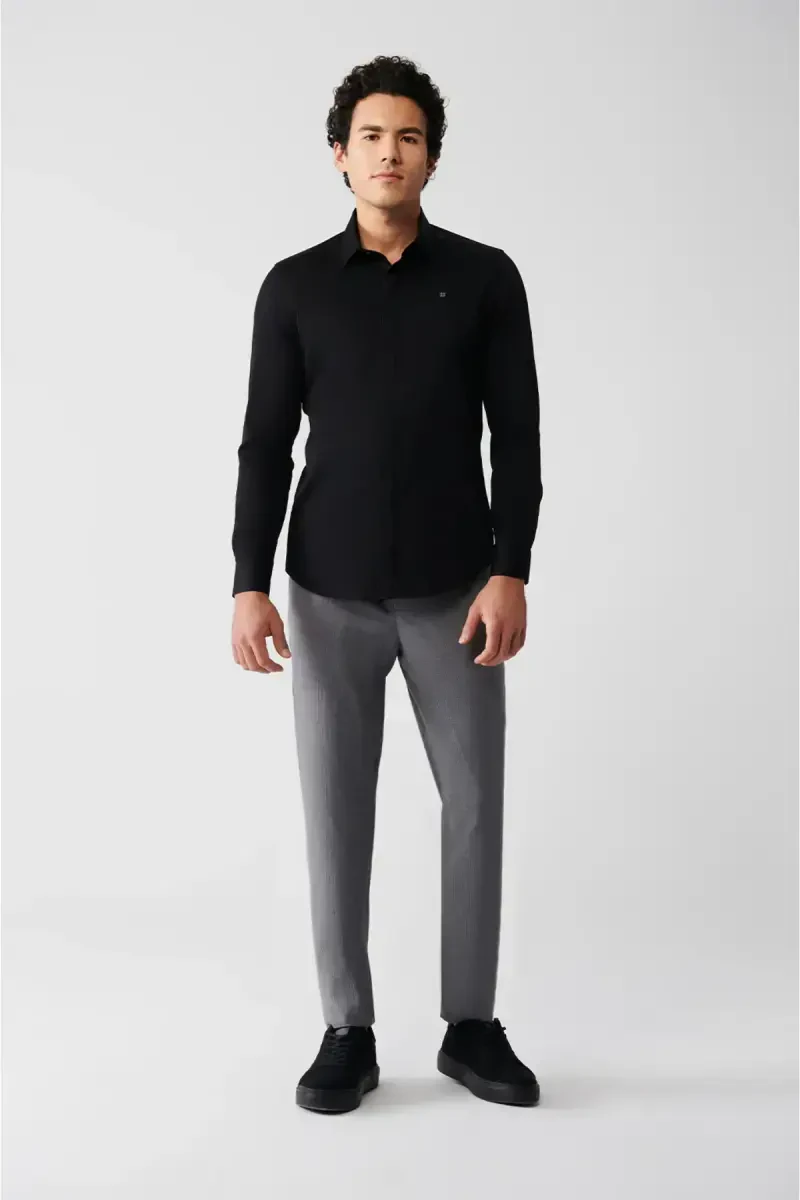 Черная приталенная мужская рубашка из хлопкового сатина | Классический воротник, длинный рукав