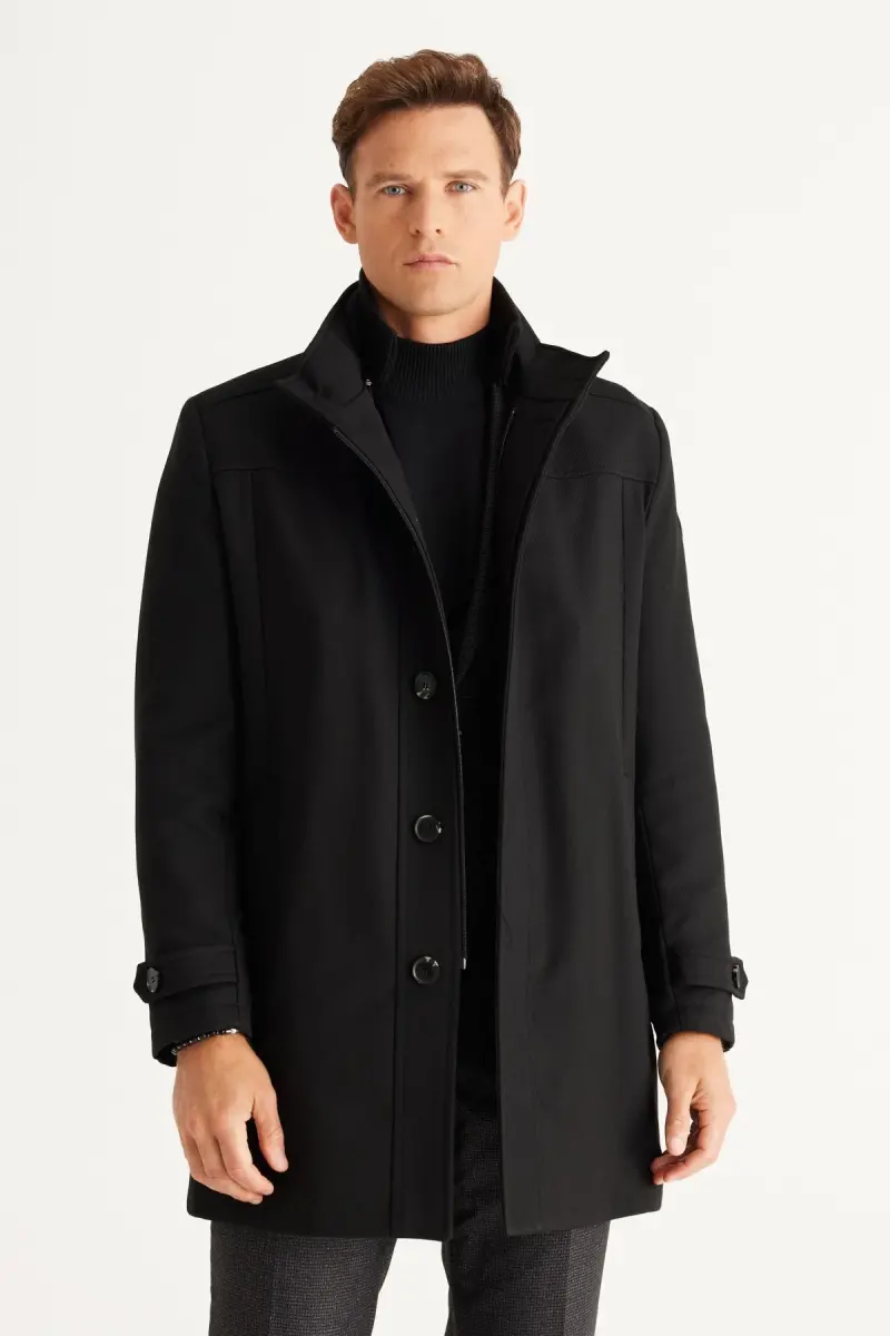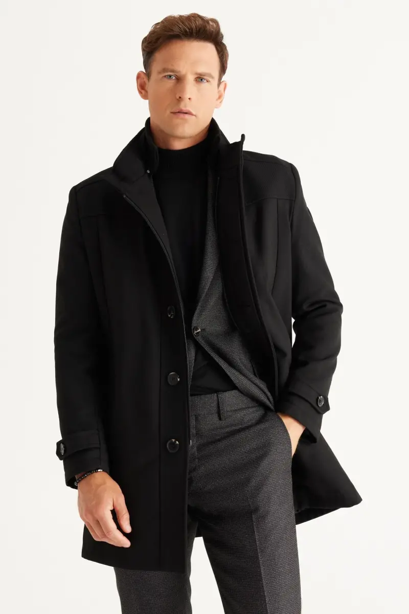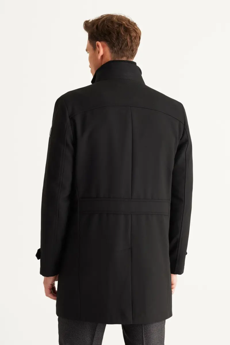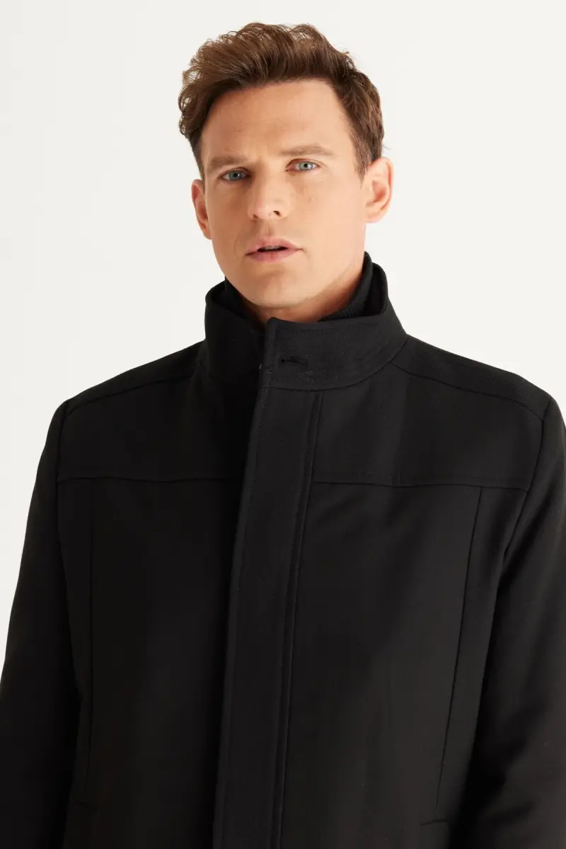 Erkek Siyah Standart Fit Normal Kesim Dik Yaka Yünlü Desenli Kaban-Siyah