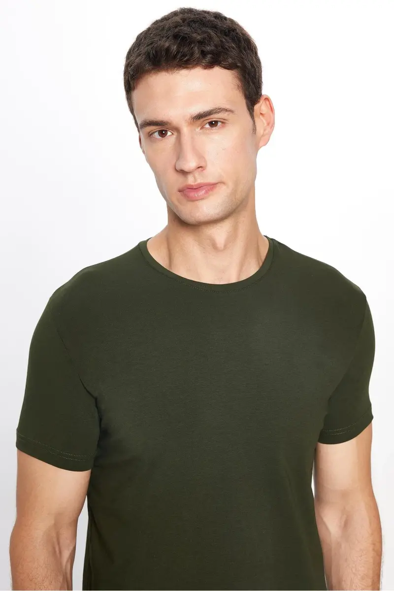 Erkek Slim Fit Dar Kesim Pamuklu Yumuşak Doku Likralı Esnek Kumaş Basic Haki Bisiklet Yaka Tişört-Haki