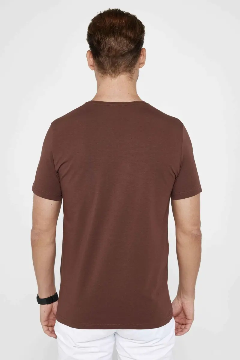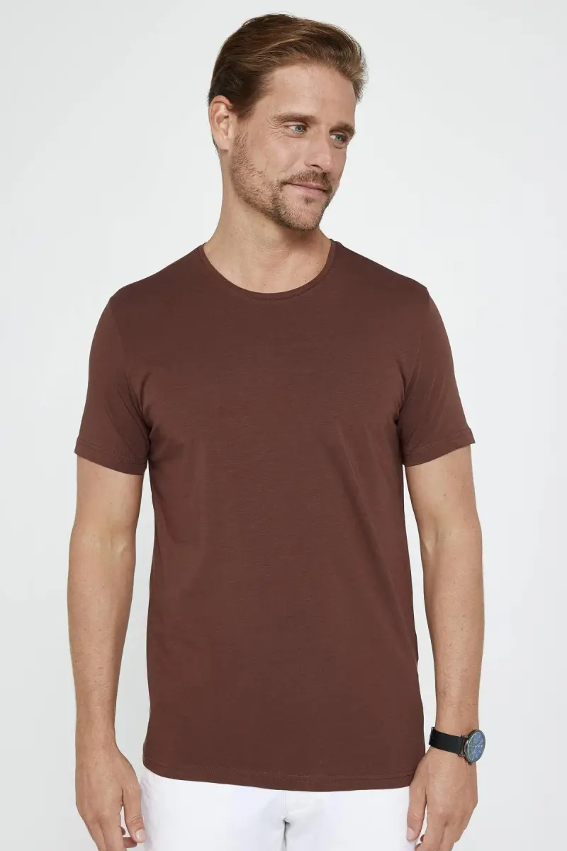 Erkek Slim Fit Dar Kesim Pamuklu Yumuşak Dokulu Esnek Kumaş Düz Basic Kahverengi Bisiklet Yaka Tişör-Kahverengi