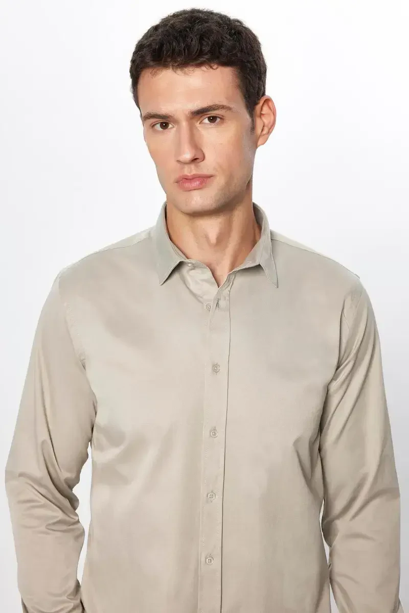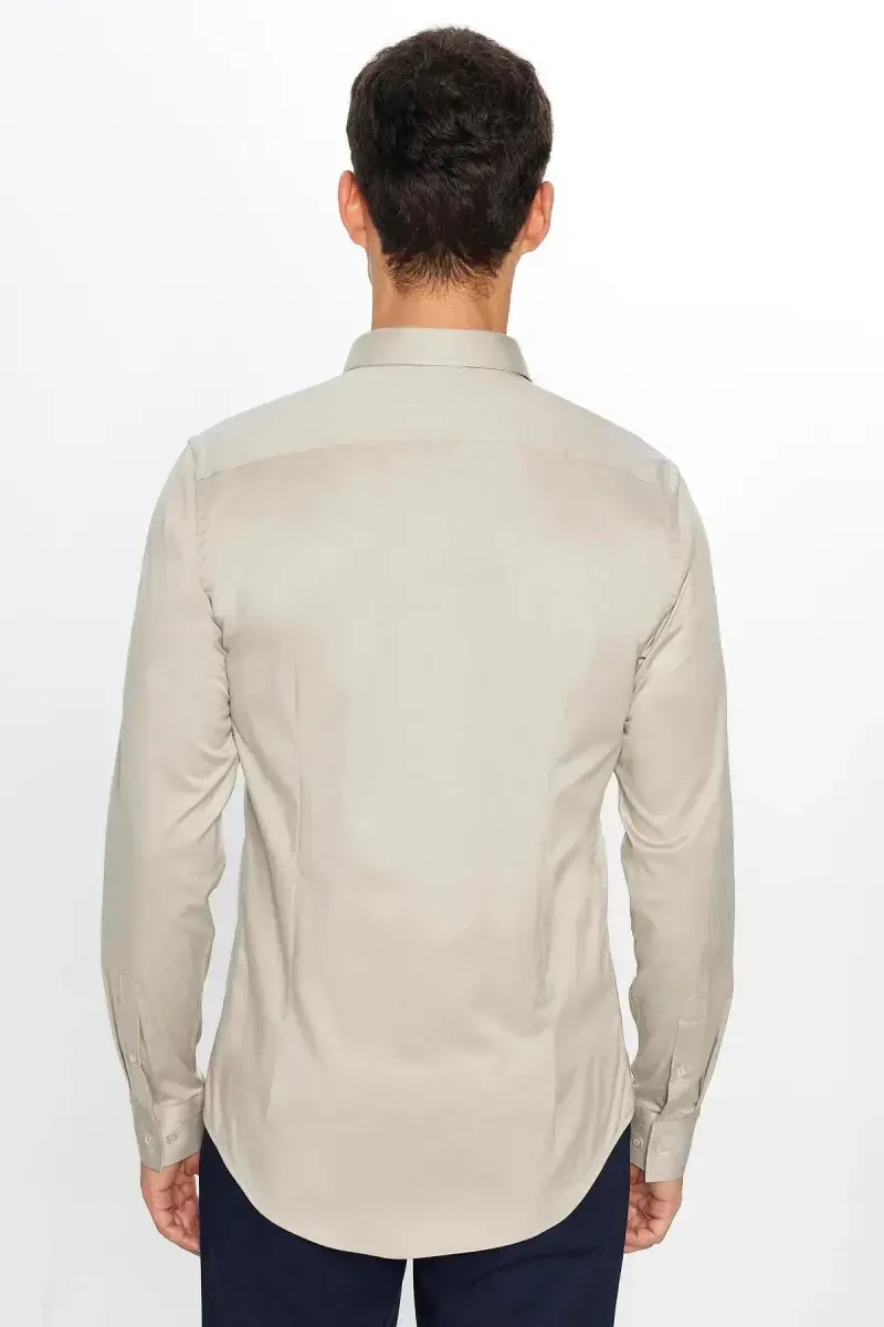Мужская рубашка с длинным рукавом из хлопкового сатина цвета камня Slim Fit дополнит ваши образы и придаст вам стильный и современный вид. Вы можете носить ее с комфортом в любых ситуациях, от деловых встреч до ужинов.