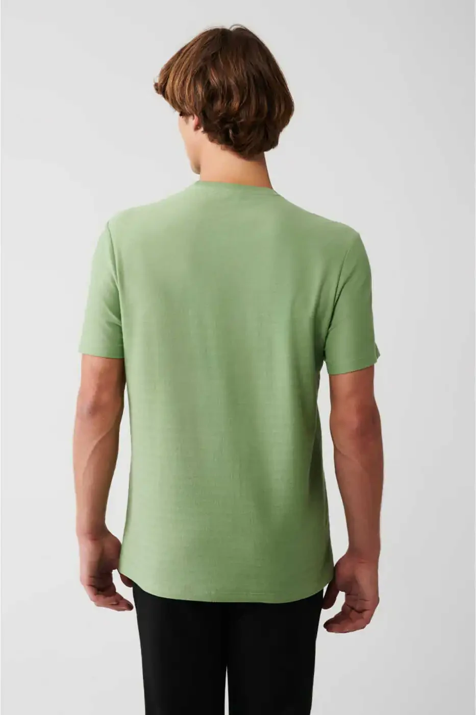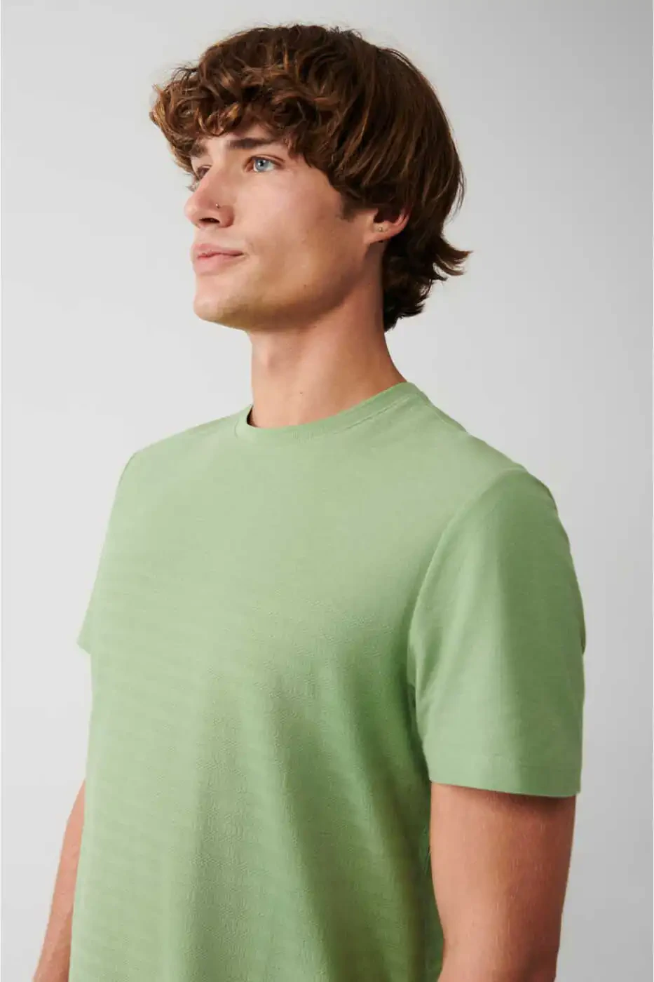Erkaklar uchun ko'k-yashil rangli 100% paxtadan tikilgan, jakkard paneli bilan bezatilgan, oddiy o'lchamdagi futbolka A31y1057 ni jinsi shimlar, shortilar va chino shimlar bilan birlashtirishingiz mumkin. Sport poyabzallari yoki klassik poyabzallar bilan to'ldirish orqali zamonaviy va qulay ko'rinishga erishishingiz mumkin.