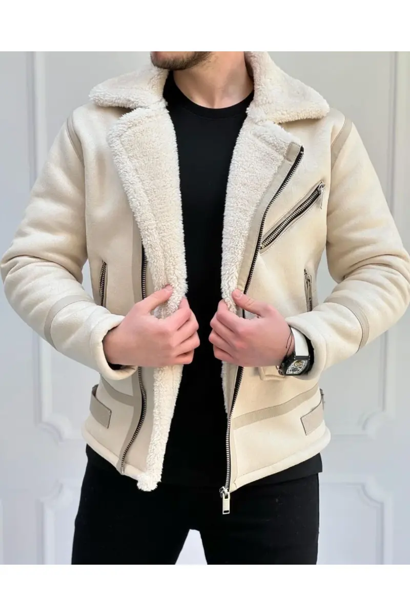 Erkek Taş Beyaz Napa Deri Mont İçi Komple Kürklü Kuzey Model Mont-Taş Beyaz