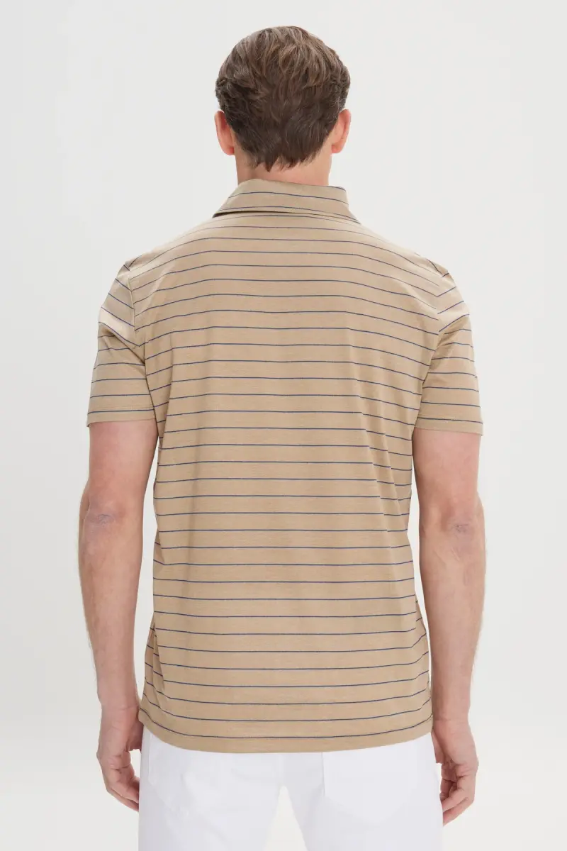 Erkek Vizon-Lacivert Regular Fit Rahat Kesim %100 Pamuk Çizgili Polo Yaka Tişört-Vizon