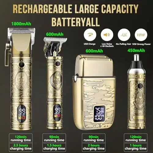 Large Capacity Battery Aad LCD Display: The LCD display clearly shows power left, oiling reminder, and charging reminder. Hair clippers charging 2.5 hours use time 150 minutes, Hair trimmer charging 1.5 hours to enjoy 90 minutes of trimming, Foil shavers charge 2 hours to enjoy 90 minutes of trimming, Nose trimmer charge 1 hour use time 120 minutes.