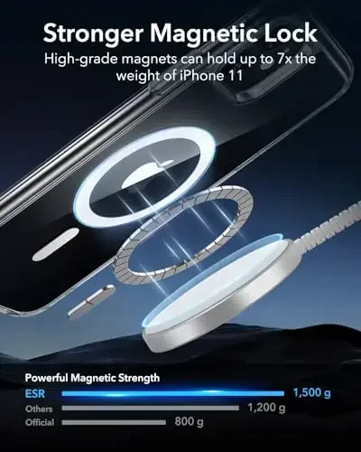 Protect and showcase the elegance of your iPhone 11 with the ESR HaloLock MagSafe Compatible Case, specifically designed for your device. This case combines military-grade drop protection, strong magnetic locking, and a transparent design to elevate your iPhone 11 experience. The ESR HaloLock case fits your iPhone 11 perfectly, preserving the original design of your device while providing superior protection against daily bumps, scratches, and drops. Thanks to its reinforced corners and raised edges, your screen and camera remain safe. HaloLock technology ensures seamless compatibility with MagSafe accessories through powerful magnets integrated into the back of the case. Easily place it on wireless chargers and enjoy secure charging. Magnets with 1,500 g of holding force securely hold MagSafe wallets, car mounts, and other accessories. Now you don't have to worry about your phone slipping or falling while wirelessly charging. The ESR HaloLock case not only offers protection and functionality but also highlights the aesthetics of your iPhone 11. The transparent acrylic back allows you to showcase the color and design of your phone, while its scratch-resistant structure ensures that your case looks new for a long time. The slim and lightweight design allows you to carry your phone comfortably in your pocket or bag. Easily accessible buttons and precise cutouts allow you to use all the features of your iPhone 11 seamlessly. Specially designed openings for the speaker, charging port, and camera allow you to access all functions without removing the case. The ESR HaloLock case will become an indispensable part of your daily life and will keep your iPhone 11 safe at all times. Thanks to ESR's detailed installation videos, frequently asked questions section, comprehensive 12-month protection plan, lifetime support, and personalized assistance, we are always there for you if you have any questions about your product. If you are looking for perfect protection and style for your iPhone 11, the ESR HaloLock MagSafe Compatible Case is for you.