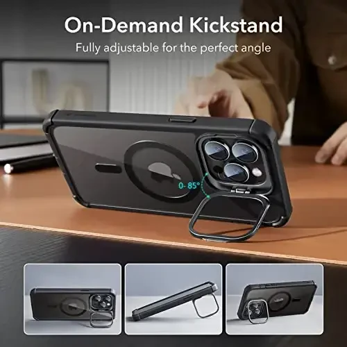 Meet the ESR Armor Series case for your iPhone 14 Pro! This case not only provides protection but also features a design that enhances usability and complements your device's style. The ESR for iPhone 14 Pro Case with Stand stands out with its MagSafe compatibility and convenient stand feature, protecting your phone from all angles.This case is specifically designed for your iPhone 14 Pro and offers a perfect fit. The package includes tempered glass lens protectors to shield your phone's camera lenses from scratches. This ensures that one of the most vulnerable parts of your phone, the camera lenses, remains safe.Thanks to its 360° protection, every corner and surface of your phone is shielded from impacts, scratches, and dust. The scratch-resistant acrylic back, combined with shock-absorbing Air Guard corners and dust protectors, provides protection that exceeds military standards. Additionally, it offers a complete security solution with a built-in screen protector and camera lens protectors.One of the most notable features of the ESR Armor Series case is its fully adjustable stand. With the Stash Stand feature, you can comfortably use your phone in either vertical or horizontal orientation, at any angle between 15° and 85°. This feature provides excellent comfort when making FaceTime calls or watching your favorite series. Enjoy hands-free usage!Thanks to its strong magnetic lock, it ensures full compatibility with MagSafe chargers and accessories. The built-in magnetic ring offers a holding force of 1,500 g without any obstruction. This allows you to securely attach your phone to a MagSafe charger and easily use your accessories.The Stash Stand is made of high-quality zinc alloy and has a corrosion-resistant matte surface. This ensures it retains its new look for a long time. The laboratory-tested hinge maintains its strength even after more than 3,000 uses. The ESR Armor Series case offers long-lasting and durable use.ESR prioritizes customer satisfaction. With detailed setup videos, frequently asked questions (FAQ), a comprehensive 12-month protection plan, lifetime support, and personalized assistance, it provides you with complete customer support. Know that you are safe with ESR!