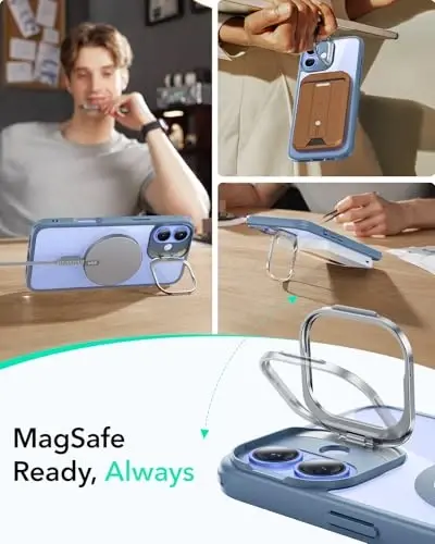 Compatibility: Only compatible with iPhone 16; precisely aligned cutouts for speakers and ports allow full functionality; supports wireless charging.Military-Grade Protection: rigorously tested to ensure total protection on all sides, keeps your phone safe from drops, bumps, and scratches.Built-in Stash Stand: the adjustable built-in stand provides a stable and convenient way to keep your phone upright while you watch videos, video chat, or browse the web.Screen and Camera Protection: raised screen edges and Camera Guard lens frame provide enhanced scratch protection where it really counts.Stay Original: scratch-resistant acrylic back lets you show off your iPhone’s true style in stunning clarity that lasts.Product DescriptionProtect your device and reflect your style with the ESR Classic Series clear blue case designed for your iPhone 16. This case is only compatible with iPhone 16 and features precise cutouts for speakers, ports, and wireless charging capabilities, so you can use all your phone's functions without restriction. The ESR Classic Series is rigorously tested to provide military-grade protection. This means your phone is fully protected from drops, bumps and scratches from all sides. It is designed to withstand the rigors of daily use and keeps your phone looking like new. The integrated stash stand is another important feature of this case. The adjustable stand offers a stable and convenient way to keep your phone upright while you watch videos, video chat, or browse the web. The stand is adjustable at different angles so you always have the best viewing angle. Screen and camera protection is also an important part of this case. Raised screen edges and a Camera Guard lens frame provide enhanced scratch protection in the most sensitive areas of your phone. These features help protect your screen and camera from scratches and other damage. The clear acrylic back lets you show off your iPhone's original design. The scratch-resistant material ensures that the case stays clear and clean for a long time. This way, you can protect your phone without sacrificing its aesthetics. The ESR Classic Series clear blue case is the perfect choice for your iPhone 16. It offers both protection and style. With this case, you can keep your phone safe while reflecting your personal style. While continuing to use all of your phone's features, you can also protect your device from everyday damage. The transparent design of the case allows you to showcase the color and design of your phone, so you can always look stylish and modern.Product Features* Compatibility: Only compatible with iPhone 16.* Military Grade Protection: Provides full protection against drops, bumps and scratches.* Integrated Storage Stand: Adjustable stand is ideal for watching videos and video chatting.* Screen and Camera Protection: Raised edges and lens frame provide protection against scratches.* Stay Original: Scratch-resistant acrylic back showcases the phone's design.* Precise Cutouts: Cutouts are available for speakers, ports and wireless charging.* Transparent Design: Shows the original color and design of the phone.* Adjustable Stand: Adjustable stand at different viewing angles.* Easy to Use: Easy to put on and take off the case.Additional InformationThe ESR Classic Series clear blue case is the perfect choice for those looking for both style and protection for their iPhone 16. Features such as military-grade protection, integrated stand and transparent design set this case apart from others. While keeping your phone safe, you can also reflect your personal style.