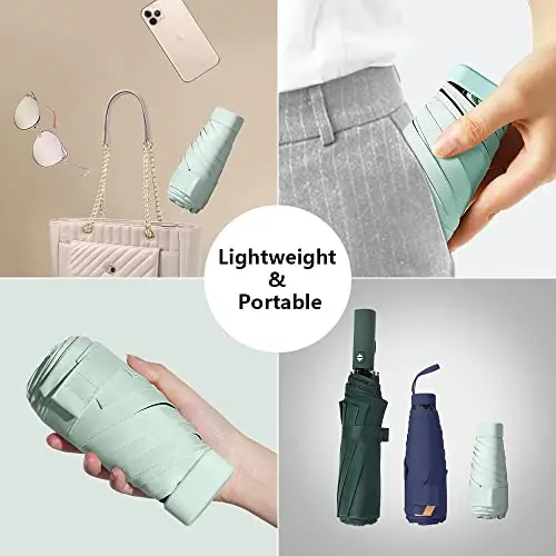 ESUFEIR Mini Travel Sun Umbrella is the perfect travel companion, combining elegance and practicality. Designed especially for women, men, and children, this compact umbrella takes up almost no space in your bag or suitcase while providing full protection from the sun's harmful UV rays and rain. With its green color, this mini umbrella is not only functional but also an accessory that complements your style.ESUFEIR Mini Travel Sun Umbrella is designed to accompany you in both sunny and rainy weather. The black coating on the inside provides UPF 50+ protection, blocking 99% of UV rays. This helps protect your skin from sunburn on hot summer days and keeps you cool. The waterproof coating on the outer surface prevents you from getting wet in rainy weather.One of the most striking features of this umbrella is its lightweight and compact design. Weighing only 10 oz and measuring 5.5 inches in length, this mini umbrella covers a wide area of 35 inches when opened. This makes it comfortable to use on trips, business trips, camping, or daily use. It easily fits in your bag, briefcase, suitcase, or backpack, so you can always have it with you.ESUFEIR Mini Travel Sun Umbrella is made of durable materials. Thanks to its 6 fiberglass ribs and high-strength iron shaft, it is lightweight and portable, as well as wind-resistant. It can withstand light breezes and offers long-lasting use.This mini umbrella is also very easy to use. It opens and closes manually. To open the umbrella, first open the buckle of the strap and shake the umbrella gently to prevent the beads from getting caught in the lace. Push the plastic slider away, keeping your finger away from the button, and when you hear the click, the umbrella will fully open and lock into position. To close, press the button and pull the plastic slider towards the handle. Finally, fold the umbrella neatly, close the buckle and place it in its box.As ESUFEIR, we always prioritize customer satisfaction. If you have any questions or concerns about our product, please do not hesitate to contact us. If you contact us before making a return request, we will be happy to respond to you within 12 hours. Enjoy the sun and rain with ESUFEIR Mini Travel Sun Umbrella!