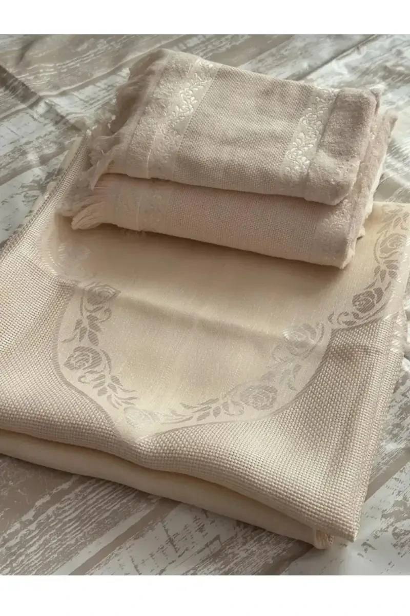 Set içeriği: 1 adet tek kişilik etamin işlemeli seccade, 1 adet küçük havlu, 1 adet büyük havlu. Kappiçino renk tonu, fotoğraflardaki ışık farklılıklarından dolayı değişiklik gösterebilir. Ürünün uzun ömürlü olması için elde veya düşük sıcaklıkta makinede yıkanması tavsiye edilir. Ağartıcı kullanmaktan kaçınınız.