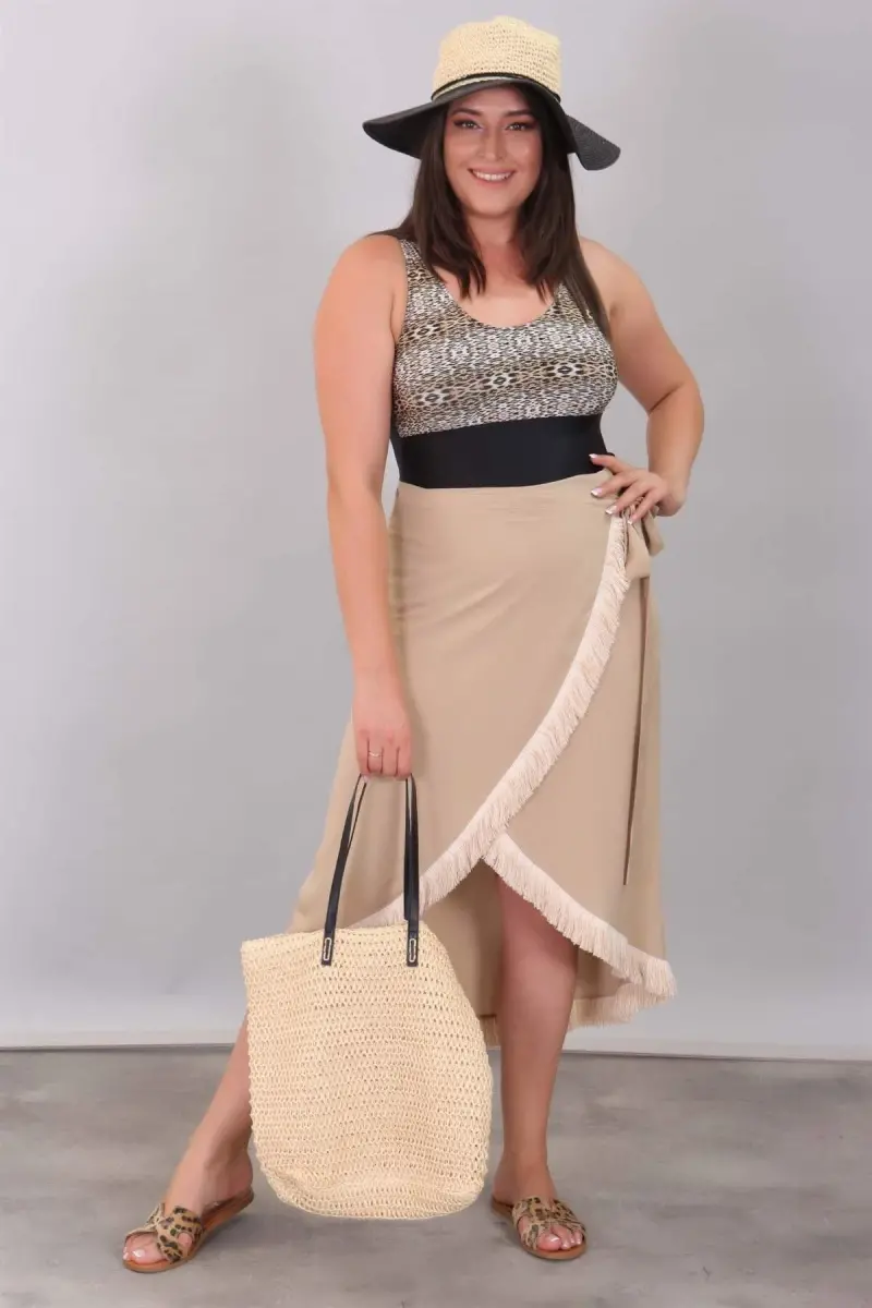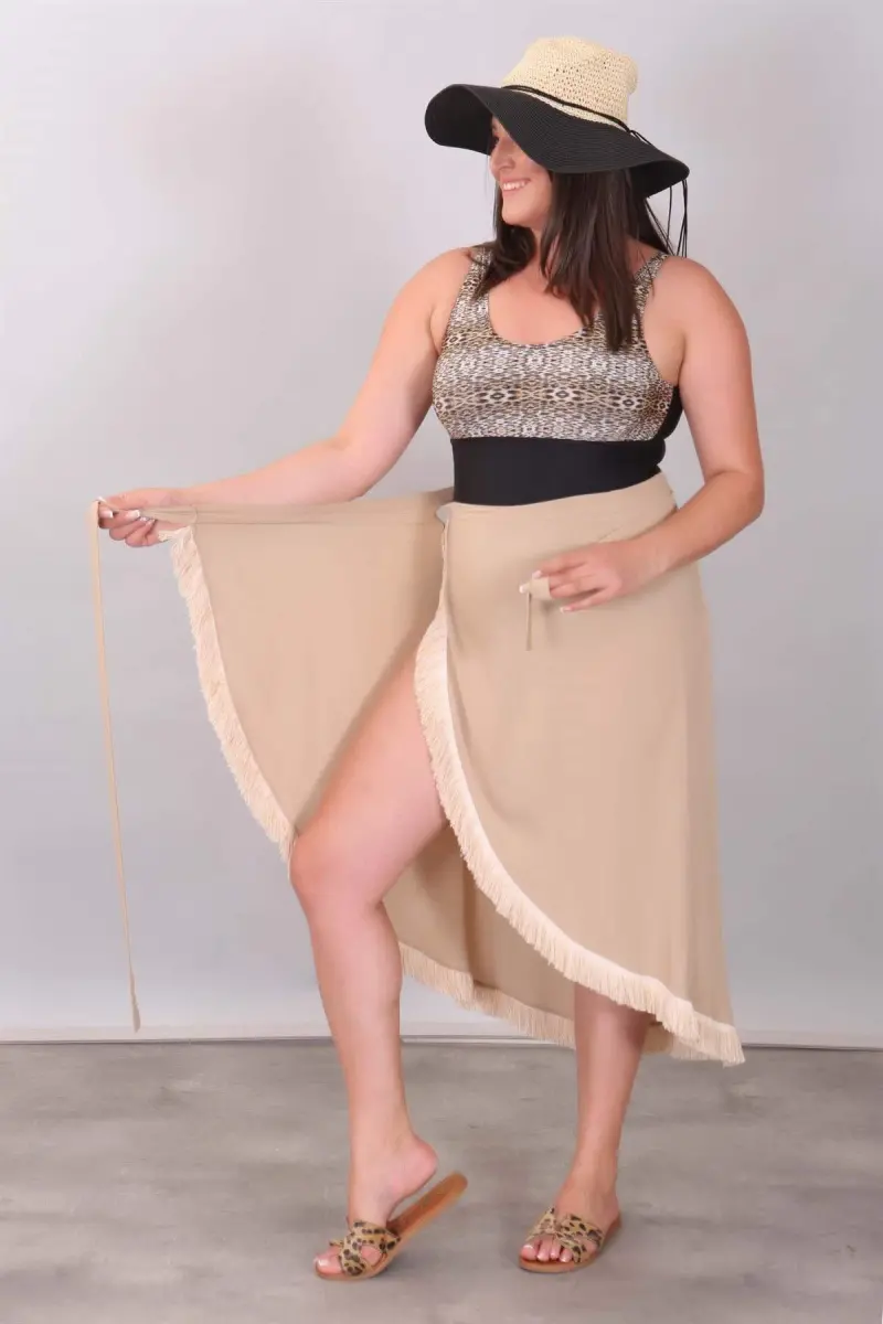 Eteği Püsküllü Bej Pareo Ürün Özellikleri: Rahat kumaşı ve kalıbı ile kullanımı kolay Püskül detayı ile şık bir tasarım Diz hizası boy Ürün Açıklaması: Eteği Püsküllü Pareo ile muhteşem bir yaz seni bekliyor! Eteği Püsküllü Pareo capcanlı renleri ve dinamik tavrıyla yaz enerjisini bedenine yansıtır. Hem rahatlığı hem de şıklığı ile göz kamaştıran Eteği Püsküllü Pareo, rahat yapısıyla tarzına çok daha çekici bir duruş kazandırır. Eteği Püsküllü Pareo,rahat kumaşıyla tenini narin bir şekilde kavrar ve üstün konforu gün boyu yaşamanı sağlar. Sen de Eteği Püsküllü Pareo ile nefes kesen plaj kombinleri oluşturarak çok şık bir stile kavuşabilirsin! Renk: Bej Malzeme: % 100 Viskoz Ölçüler: Manken Ölçüleri: Omuz: 47 cm. - Göğüs: 97 cm. - Basen: 105cm - Bel: 80 cm. - Boy: 1,79 cm. Ürün boyu 80 cm. 'dir. Model Bedeni: 44