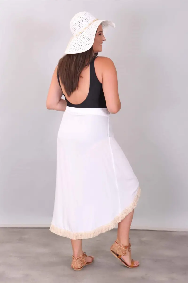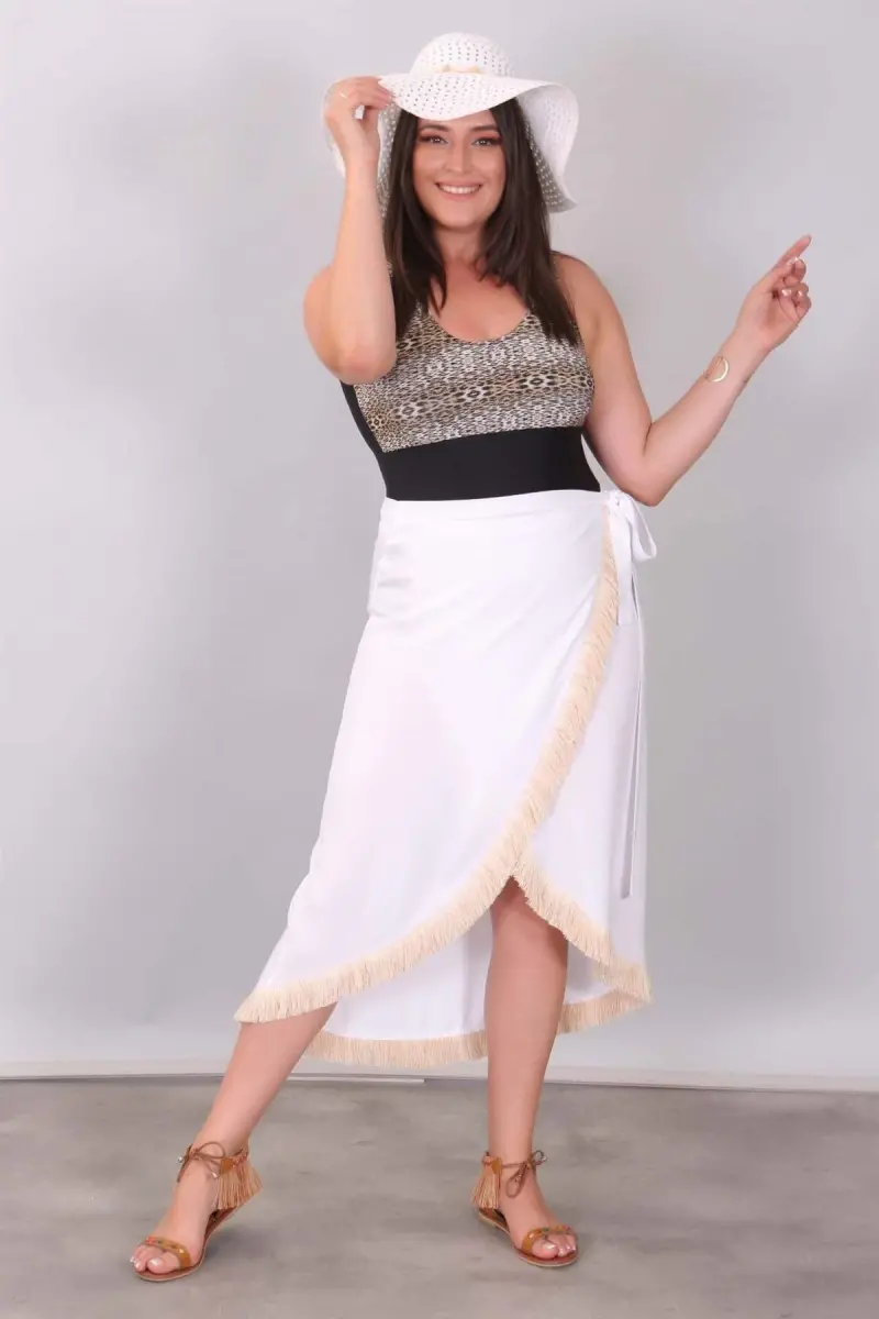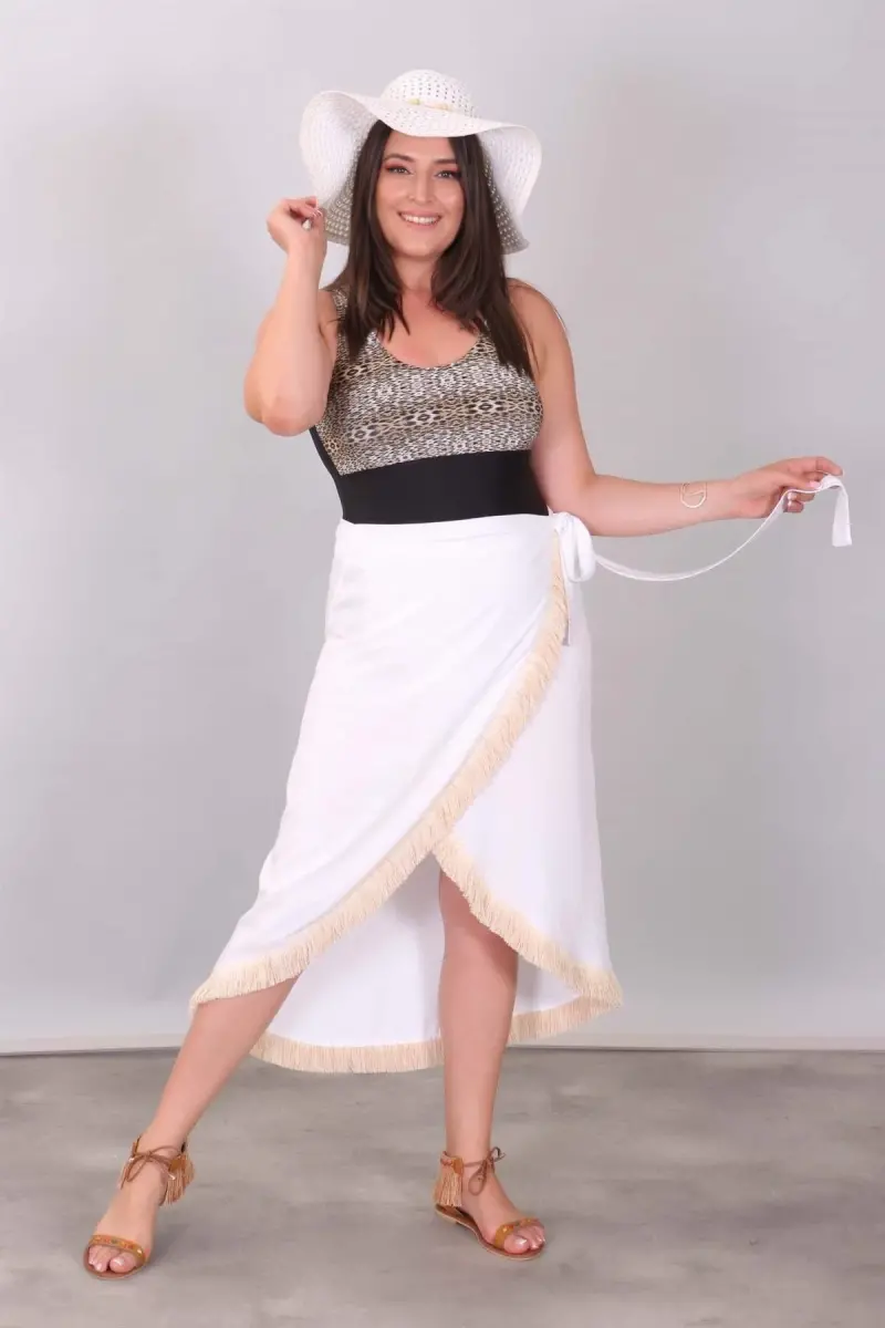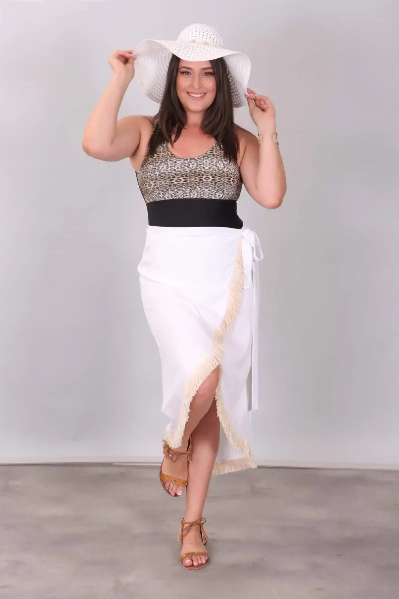 Eteği Püsküllü Beyaz Pareo Ürün Özellikleri: Rahat kumaşı ve kalıbı ile kullanımı kolay Püskül detayı ile şık bir tasarım Diz hizası boy Ürün Açıklaması: Eteği Püsküllü Pareo ile muhteşem bir yaz seni bekliyor! Eteği Püsküllü Pareo capcanlı renleri ve dinamik tavrıyla yaz enerjisini bedenine yansıtır. Hem rahatlığı hem de şıklığı ile göz kamaştıran Eteği Püsküllü Pareo, rahat yapısıyla tarzına çok daha çekici bir duruş kazandırır. Eteği Püsküllü Pareo,rahat kumaşıyla tenini narin bir şekilde kavrar ve üstün konforu gün boyu yaşamanı sağlar. Sen de Eteği Püsküllü Pareo ile nefes kesen plaj kombinleri oluşturarak çok şık bir stile kavuşabilirsin! Renk: Beyaz Malzeme: % 100 Viskoz Ölçüler: Manken Ölçüleri: Omuz: 47 cm. - Göğüs: 97 cm. - Basen: 105cm - Bel: 80 cm. - Boy: 1,79 cm. Ürün boyu 80 cm. 'dir. Model Bedeni: 44