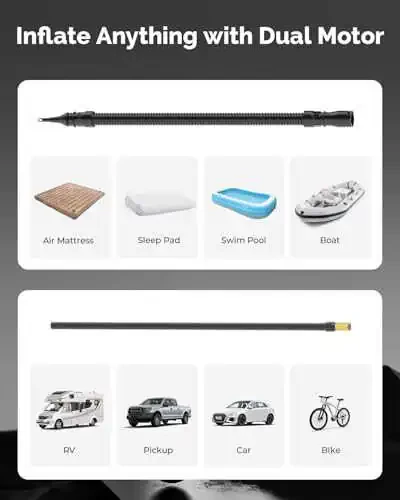 ETENWOLF VORTEX S6 — мощный и многофункциональный аккумуляторный воздушный компрессор, предназначенный для накачивания различных изделий, таких как тяжелые автомобили, легковые автомобили, велосипеды, мячи, надувные бассейны и матрасы. (Не подходит для SUP-досок). Благодаря высокопроизводительному двухцилиндровому насосу и аккумулятору емкостью 19200 мАч он обеспечивает исключительно высокую скорость накачивания и длительное время работы. Vortex S6 может накачать 31-дюймовую шину всего за 1 минуту (30-35 PSI) и накачать до 18 шин F150 (245 70/R17 31") с 30 PSI до 35 PSI на одном заряде. Благодаря 100% рабочему циклу вы можете непрерывно накачивать все четыре шины F150 с 0 до 35 PSI без перерывов. Встроенная функция автоматической остановки автоматически останавливает накачивание при достижении заданного давления, предотвращая перекачивание. Семь предустановленных режимов и память предустановленного давления обеспечивают простоту использования. Кроме того, светодиодный фонарь мощностью 1000 люмен обеспечивает отличное освещение в темноте, что делает его идеальным инструментом для использования в чрезвычайных ситуациях или в ночное время. Благодаря прочной конструкции, усовершенствованной системе охлаждения и двусторонней быстрой зарядке Vortex S6 является надежным и эффективным решением для накачивания воздуха в дороге и дома.
