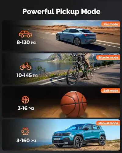 • Максимальное давление 160 PSI для автомобилей, внедорожников, велосипедов и мячей