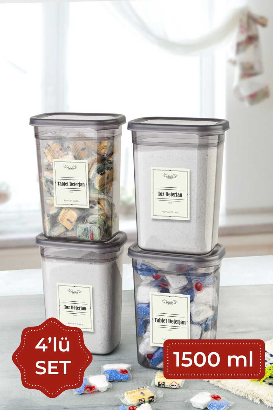 Etiketli 1500 ml 4lü Peggy Dikdörtgen Deterjan Saklama Kabı Seti Antrasit-Antrasit