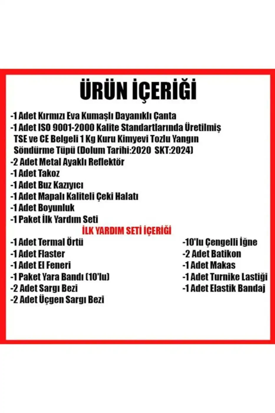 PRODUCT DESCRIPTION:Product DescriptionEva Traffic-First Aid Kit Bag is a must-have safety equipment for your vehicles. It is an ideal solution for car owners who want to pass TÜVTÜRK inspections without any problems and be prepared for unexpected situations during their journeys. This kit has a comprehensive content to help you and your loved ones in various scenarios such as traffic accidents, breakdowns or emergency medical interventions. Thanks to its durable Eva material bag, it safely stores the materials inside and makes them easily accessible. Thanks to its compact design, it does not take up much space in your vehicle and is always ready for use. Putting safety first in your travels means being prepared for possible risks you may encounter on the road. Eva Traffic-First Aid Kit Bag is not only a necessity, but also an investment that protects the health and safety of you and your loved ones. Thanks to the first aid materials in it, you can immediately intervene in minor injuries, ensure safety after an accident with traffic marking equipment, and have other tools and equipment necessary for emergencies. This kit is of great importance not only for individual car owners, but also for commercial vehicle fleets, taxi companies and public transport vehicles. Eva Traffic-First Aid Kit Bag is the perfect solution to ensure the safety of your employees and passengers, fulfill legal requirements and be prepared for possible risks. In addition, the TÜVTÜRK compatibility of the set guarantees that you will not have any problems during vehicle inspections. In this way, you save both time and avoid additional costs in the inspection processes. Remember, safety should always be a priority. Keep yourself and your loved ones safe with the Eva Traffic-First Aid Kit Bag, and make your journeys more peaceful and safe. This kit is not just a product, but also an investment in the health and safety of you and your loved ones. Keep it with you on all kinds of journeys and always be prepared for unexpected situations.Product FeaturesDurable Eva materialTÜVTÜRK compliantCompact designEasy accessibilityComprehensive first aid contentTraffic marking equipmentEmergency toolsAdditional InformationIt is recommended that you regularly check the expiration dates of the materials in the content and renew them when necessary. The content of the kit will be more effective when used by people who have received first aid training. Read the product user manual carefully and learn the correct use of the materials inside.