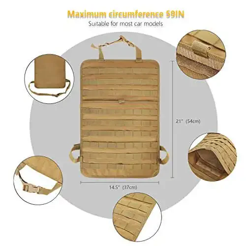sturdy and easy to install: There are slots in each bag to keep tools secure so they are not moving around in the bags. They are easy to clip on and off and easy to get to to release and particular bag. well made with 1000D nylon material:These bags are made of nylon fabric, they are very durable can stand wear and tear, are also water-resistant. The Zippers are sturdy, stitching is solid. Keep you car organized: This BXBXHD tactical organizer can store all of our loose items like first aid kid, roadside tools, charging cables, bungee cords, straps, tire pressure gauge, lug nut key, rags. The bags can even be used for things like fishing and atv riding. Suitable for most car models:MOLLE seat back organizer with pouches size: 21*14.5 inch. The maximum circumference of the fixed strap is 59in. Suitable for most vehicle seat back, SUV, truck, pickup, etc. Package: 1*tactical molle seat back organizer,1*Tactical Molle Bag,1*Medical Pouch,1*Cell Phone Pouch,1*Large Item Storage Pouch.1*Multipurpose Waist Pack. Suitable for storing mobile phones, tactical pens, Keychains, GPS devices, digital cameras, medical supplies or any necessary small tools you need,perfect for your outdoor activities.
