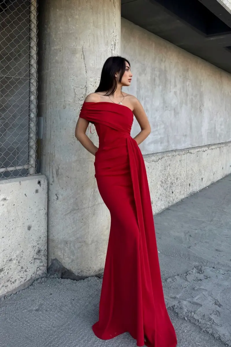 Ewo Tek Omuz Kuyruklu Abiye-Kırmızı