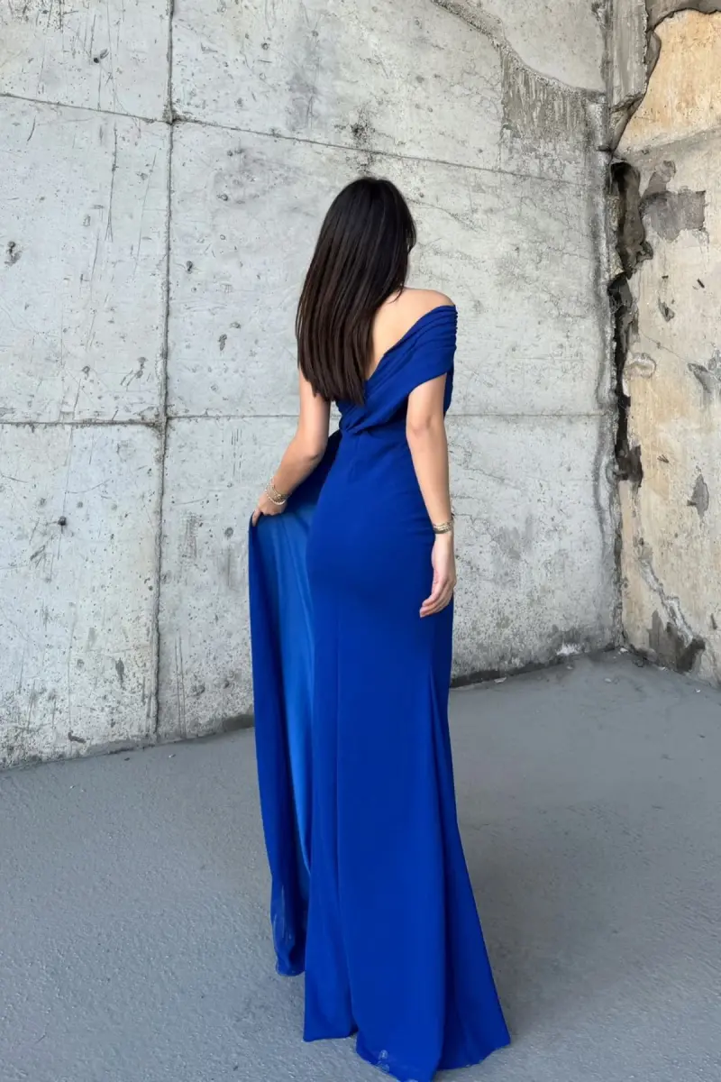 Ewo Tek Omuz Kuyruklu Abiye-Mavi