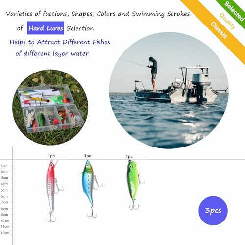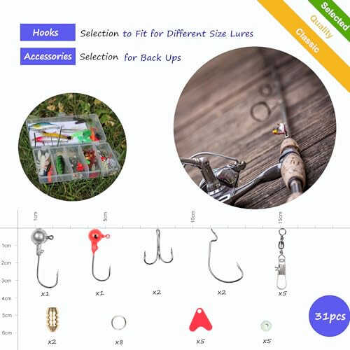 - Çeşitli renk ve boyutlarda plastik karides, solucan yemleri, kaşık yemleri, çekirge yemleri, crankbait'ler, jig'ler, kancalar ve diğer balık avı ekipmanları içerir.
