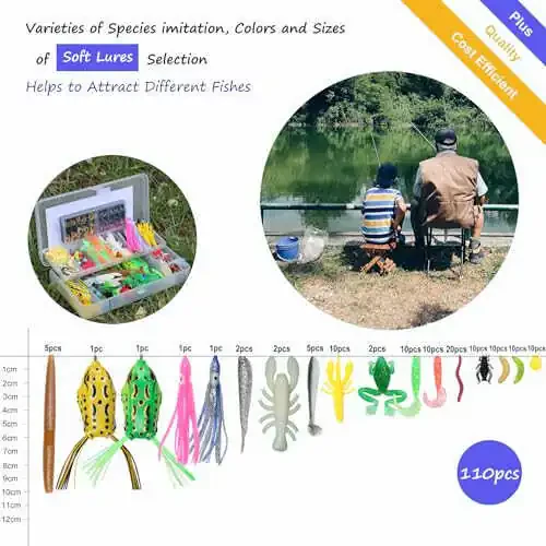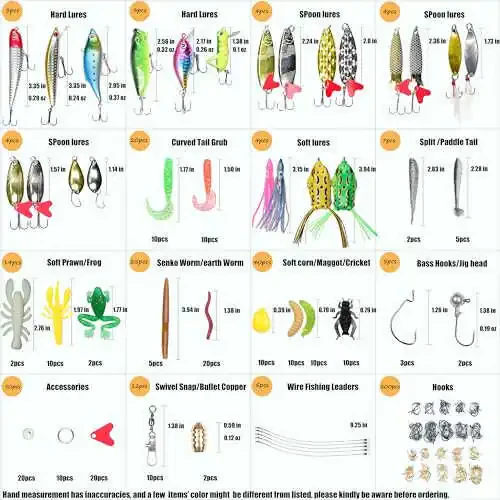 Various fishing baits: a 399pcs fishing lures set tackle box with all the necessary items, includes: 1 Crankbait, 1 Popper, 1 Pencil, 1 Minnow, 1 VIB, 1 grasshopper,12 Spoons, 20 Curved Tail Grabs,2 octopuses,2 big frogs,2 split tail fish,5 paddle tails,12 plastic shrimps, 5 Senko worms,20 earthworms, 10 corn kernels,20 Maggots,10 crickets, 3 hooks, 2 jigs,20 fishing beads, 10 rings, 20 plastic sheets, 10 swivel snaps, 10 thread bullet coppers,5 wire fishing leaders and 2 tackles hooks. Flexible fishing gear and equipment: It's been super handy for all sorts of fishing types, both freshwater and saltwater are acceptable for use with fishing tackle boxes. Furthermore, because of the wide range of fishing lures in our fishing kit and their realistic appearance. Therefore, a variety of fish, including bass, trout, salmon, walleye, and other species, can be caught with our fishing lures. With the help of our fishing gear and equipment, you may catch popular fish species. Great Fishing gift: A fishing tackle set is the perfect present for your fishing-loving friends and family members on any occasion, from Father's Day and Valentine's Day to Christmas and Thanksgiving Day. Because fishing kits come with a variety of fishing lures, spoons, and hooks that work in both freshwater and saltwater, they are quite useful. Lifelike colors: The latest patterns and lifelike colors resemble bait fish, and steel ball bearing rattles create an aggressive presentation. Artificial baits and lures are also very easy to attract fish eyes, which can be utilized in both saltwater and freshwater environments. Make the fish believe that the bait is a real fish before you can quickly hook it. High Quality Material: VIB and minnow lures are long-lasting and corrosion-resistant bec ause they are made of stainless steel. Our fishing bait won't shatter even when it encounters large fish. The fishing lures made of soft plastic are incredibly elastic and won't be torn off by the fish when they wrestle with them. Lightweight and Compact: Fishing equipment is perfect for use outdoors because fishing tackle boxes are lightweight and tiny in size. Size is about 20cm x 10.5cm x 4.5cm. Our designers pay close attention to the weight of fishing equipment and gear. The 399 things together weighed less than387g in weight. When using our fishing bait, you won't get fatigued while fishing outside, so you can simply take in the fun of fishing.