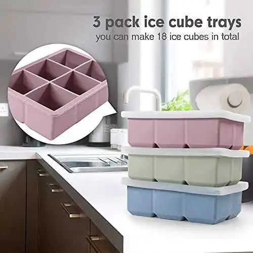 Excnorm Silicone Ice Cube Trays 3 Pack - Large Size, Leak Proof Lid, BPA Free, Stackable