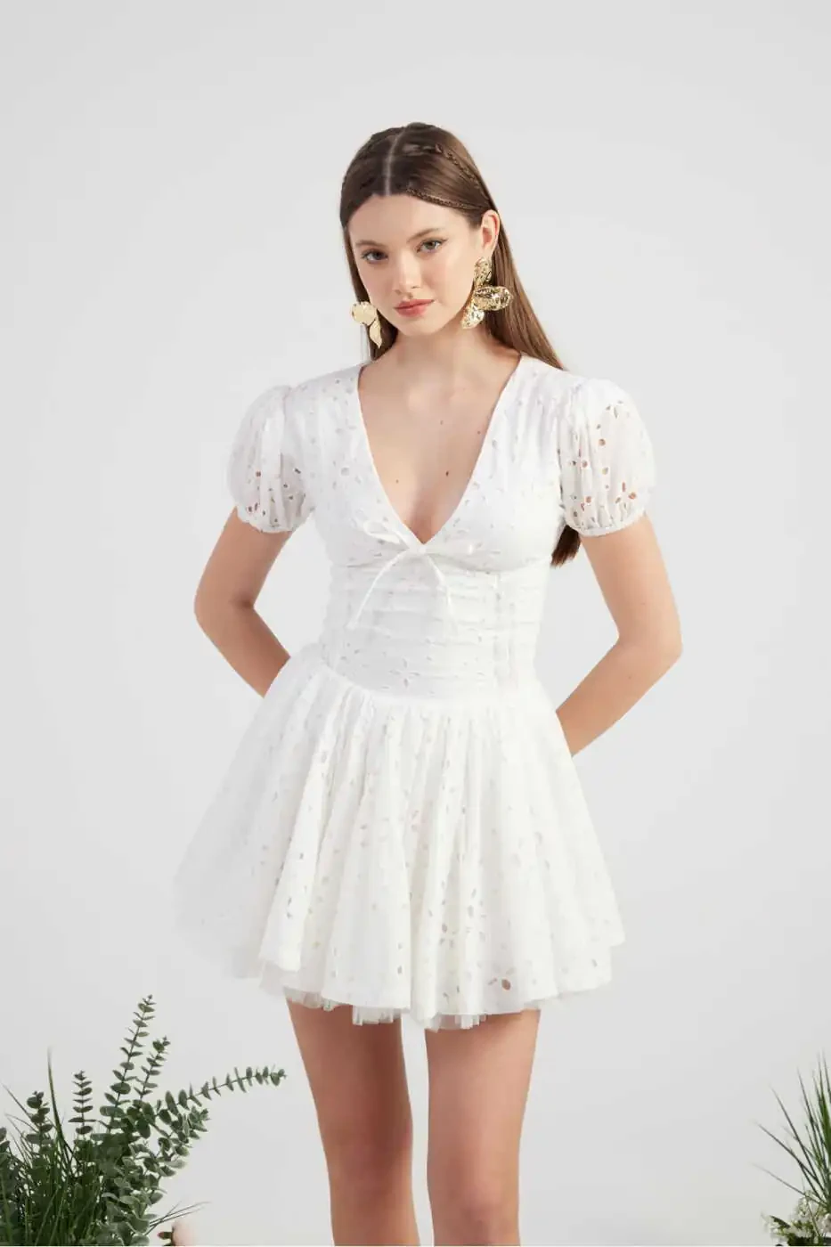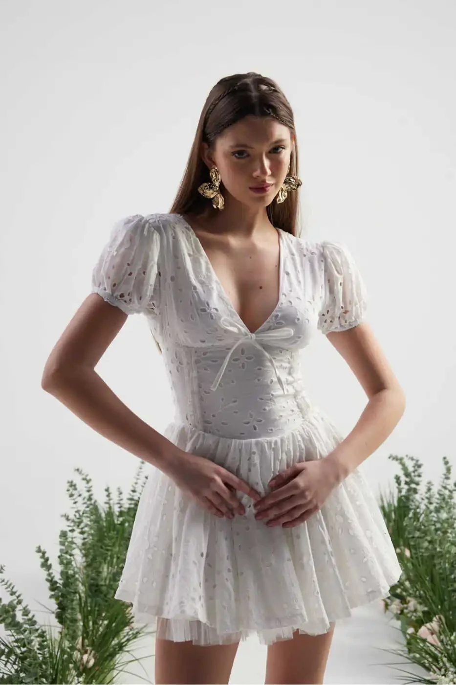 Meet the stylish and eye-catching Fistolu Tulle Detailed Mini Tina Dress from Holly Lolly! This unique design combines elegance and modern details, making you stand out in any environment. Designed with the innocence of white and the romantic touch of tulle, this mini dress will accompany you from your special occasions to your daily elegance. The scalloped fabric detail adds a different dimension to the dress, while the fitted waist cut perfectly reveals your body lines. The open back design offers a bold and assertive look. Thanks to its lined structure, you will have a comfortable wearing experience all day long. The zipper closure makes it easy to put on and take off, while completing the elegance of the dress. With its 100% cotton content, it is skin-friendly and prevents sweating with its breathable structure. The mini skirt length creates a young and dynamic atmosphere, while the tulle detail adds a fun touch to the dress. Whether you attend a stylish invitation with high heels or go for a daily stroll with sandals, the Fistolu Tulle Detailed Mini Tina Dress allows you to make a difference in every combination. Add this special design dress to your wardrobe, take your style one step further and always dazzle. The model is wearing XS size, and before placing your order, you can choose the most suitable size for you by examining the size chart in the images. Remember, with this dress, you will not only dress but also reflect your style. This unique piece produced with Holly Lolly quality will be an indispensable part of your wardrobe for many years. Enjoy being both stylish and comfortable! This dress is not just a piece of clothing, but also a form of expression. It is a perfect choice to reflect your own style and reveal your originality. Shine in every moment with the Fistolu Tulle Detailed Mini Tina Dress!