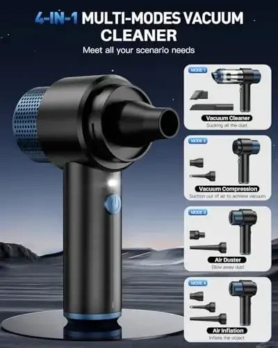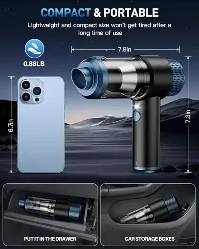 EYYA Handheld Car Vacuum Cleaner Cordless is a versatile and powerful cleaning solution that offers cleaning in every area from your home to your office, from your car to narrow corners. This 4-in-1 portable mini vacuum is not only a vacuum cleaner but also functions as an air blower, inflation pump, and vacuum compressor. This versatility is designed to meet your different cleaning needs. Thanks to its high-powered 15000PA suction power, you can easily clean even the most stubborn dirt and debris. Whether it's crumbs in your car or dust in your home, the EYYA Handheld Vacuum Cleaner provides effective cleaning on all surfaces. Thanks to its LED light, you can easily see and clean dark and hard-to-reach areas. Its cordless design offers freedom of movement and can be easily carried anywhere. With its lightweight and compact structure, it is also easy to store. Thanks to its 4000mAh battery, it offers long-lasting use and can be charged quickly with its Type-C fast charging feature. Moreover, thanks to its double filtration system, it effectively captures both large particles and fine dust, extends the life of the motor, and prevents allergic reactions. The EYYA Handheld Car Vacuum Cleaner Cordless is not only a cleaning tool but also a helper that increases your quality of life. Cleaning the interior of your car, the corners of your home, or the narrow areas of your office is now much easier and more enjoyable. Thanks to its advanced features and portable design, it will always be at your fingertips and will make your cleaning tasks easier. With its powerful suction, versatile use, and user-friendly features, the EYYA Handheld Vacuum Cleaner is an ideal solution for your cleaning needs. Whether you want to do a quick cleaning or a detailed maintenance, this vacuum will always be with you and will help you.